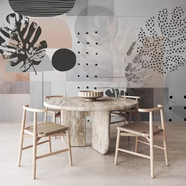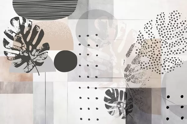 Fototapeedid Geomeetriliste kujundite ja monstera troopiliste lehtede, ringide, punktide ja joontega abstraktne trükis, kaasaegne ja minimalistlik disain Nr w09333