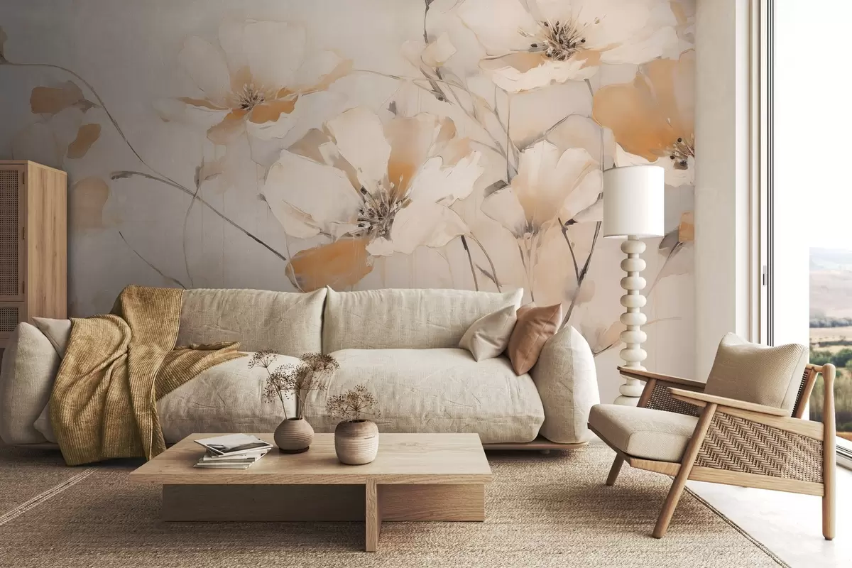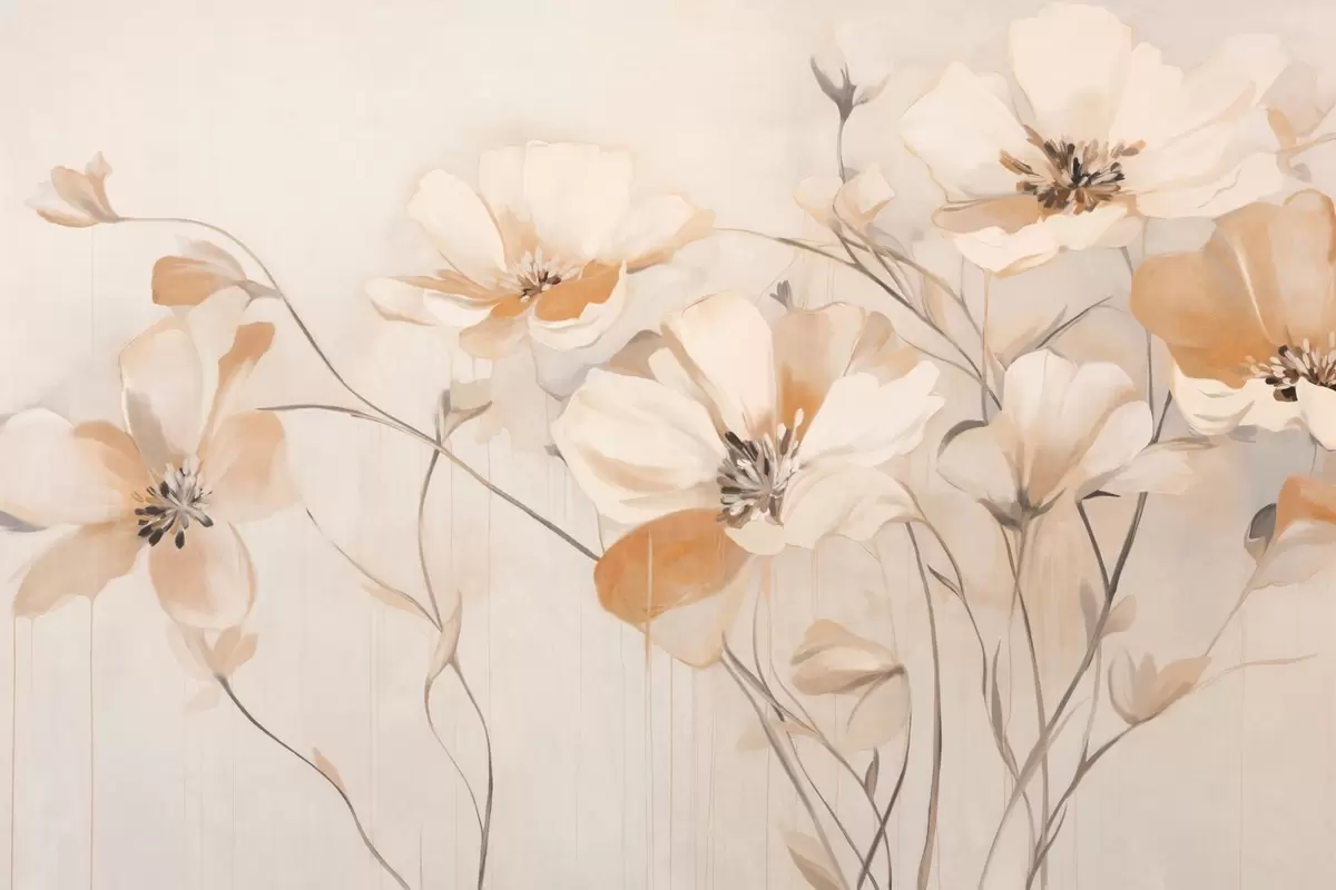 Fototapeedid Valged ja oranžid tekstuuriga lilled pikkade varrega, kerge taust, pehmed värvid, elegantne kompositsioon, õrnad pintslitõmbed Nr w09335