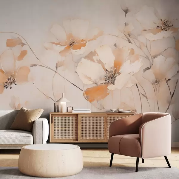 Fototapeedid Valged ja oranžid tekstuuriga lilled pikkade varrega, kerge taust, pehmed värvid, elegantne kompositsioon, õrnad pintslitõmbed Nr w09335