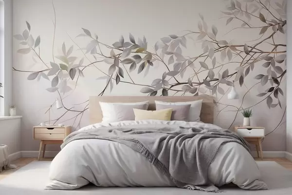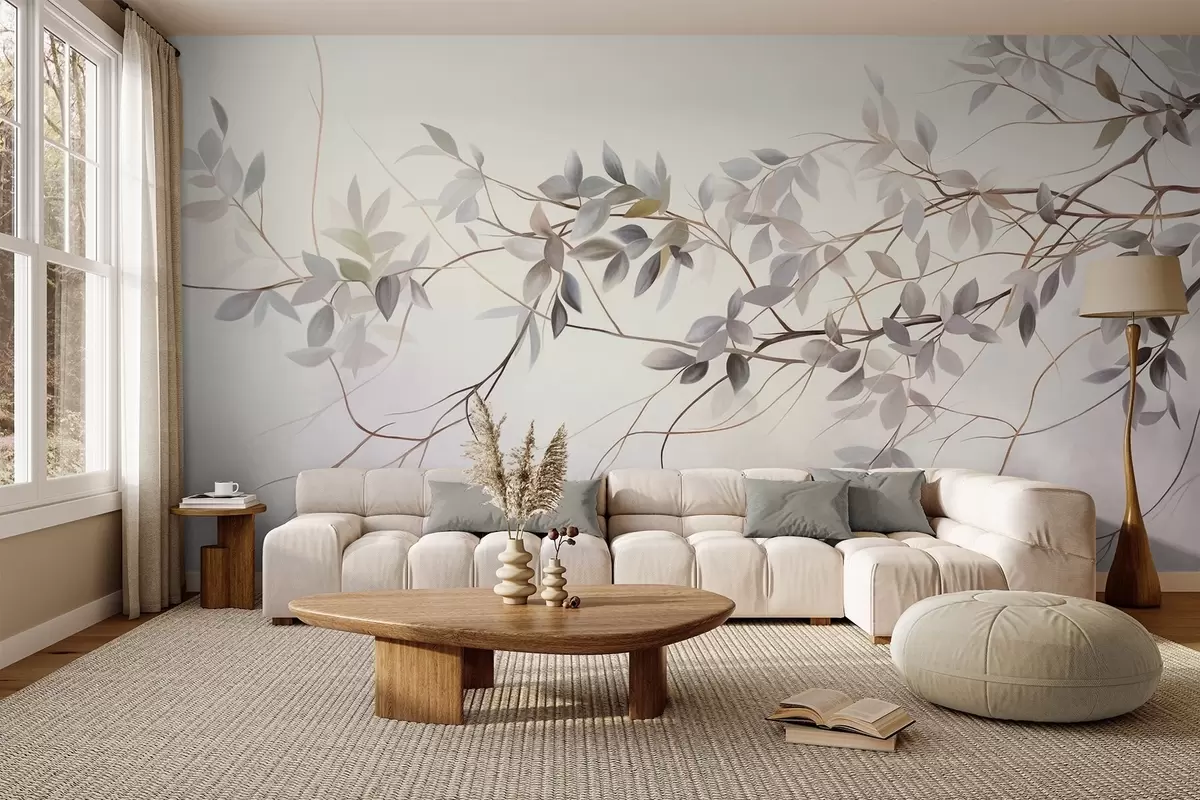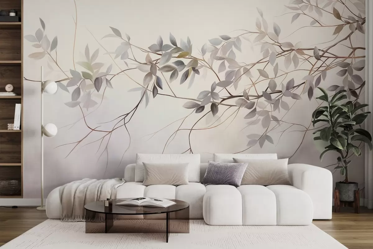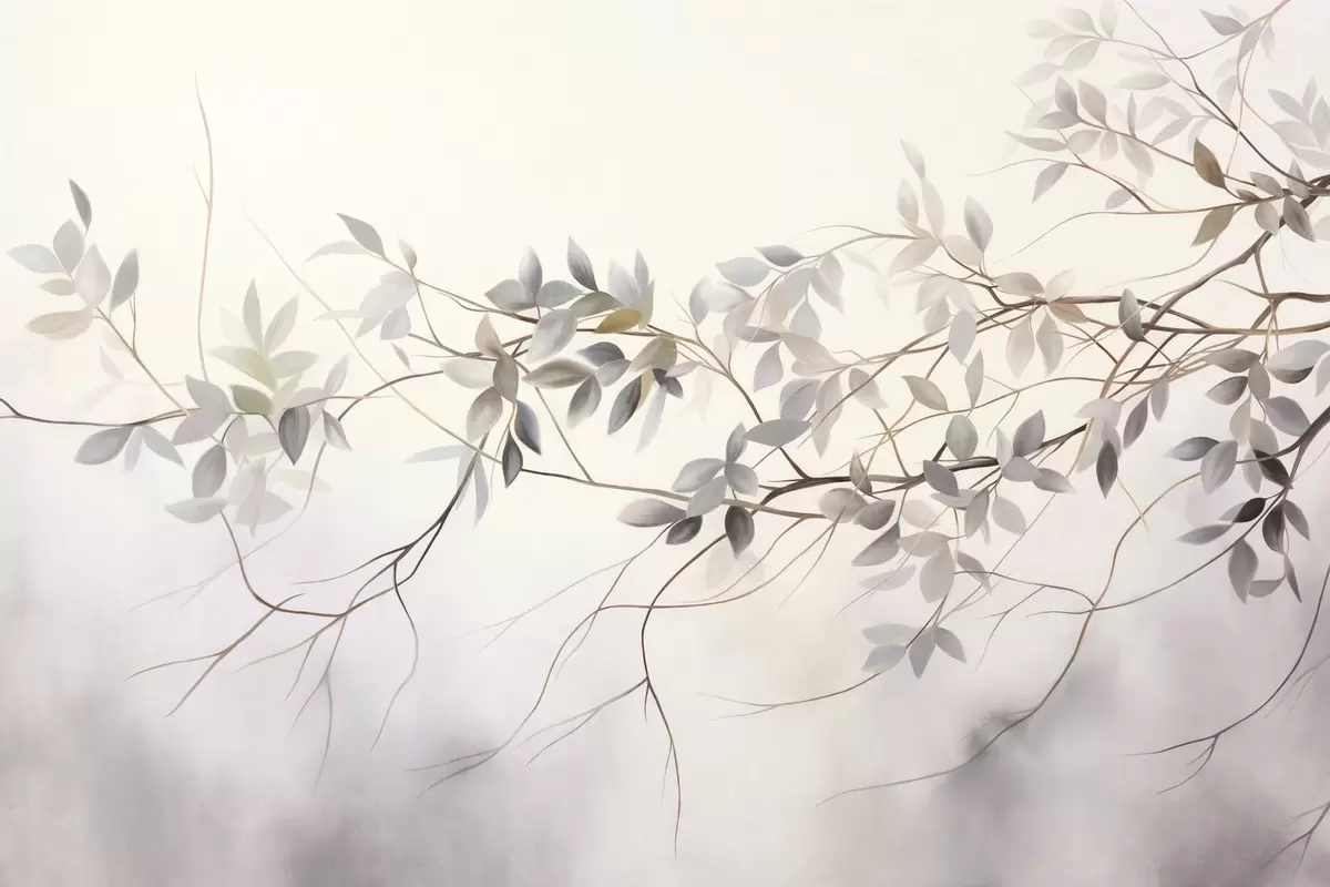 Fototapeedid Õrnad tekstuuriga oksad, millel on tuhmid hallid, lillad ja rohelised lehed pehme, ähmane taustaga Nr w09336