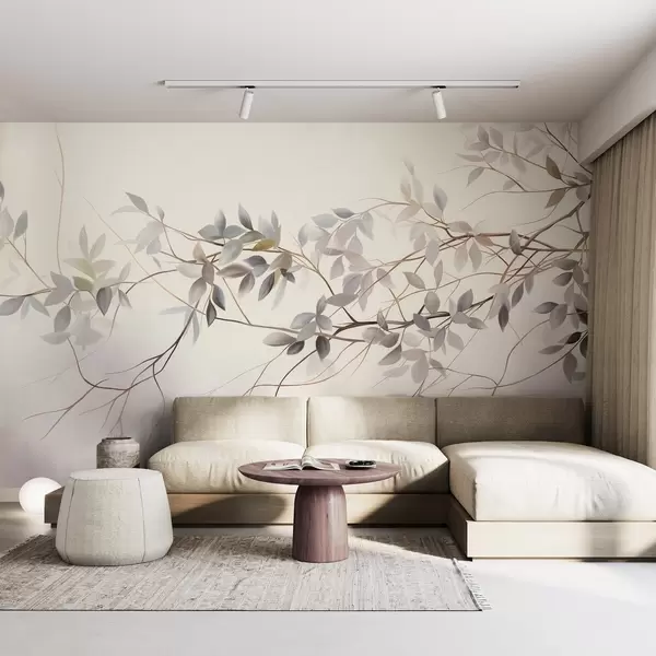Fototapeedid Õrnad tekstuuriga oksad, millel on tuhmid hallid, lillad ja rohelised lehed pehme, ähmane taustaga Nr w09336