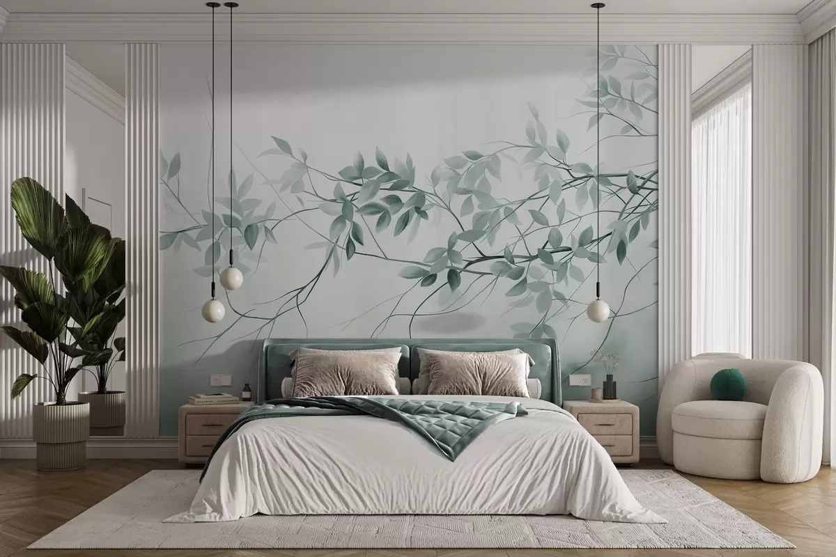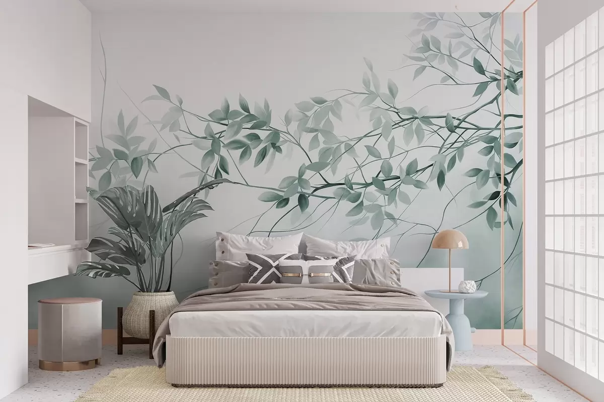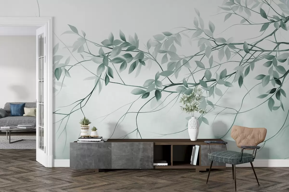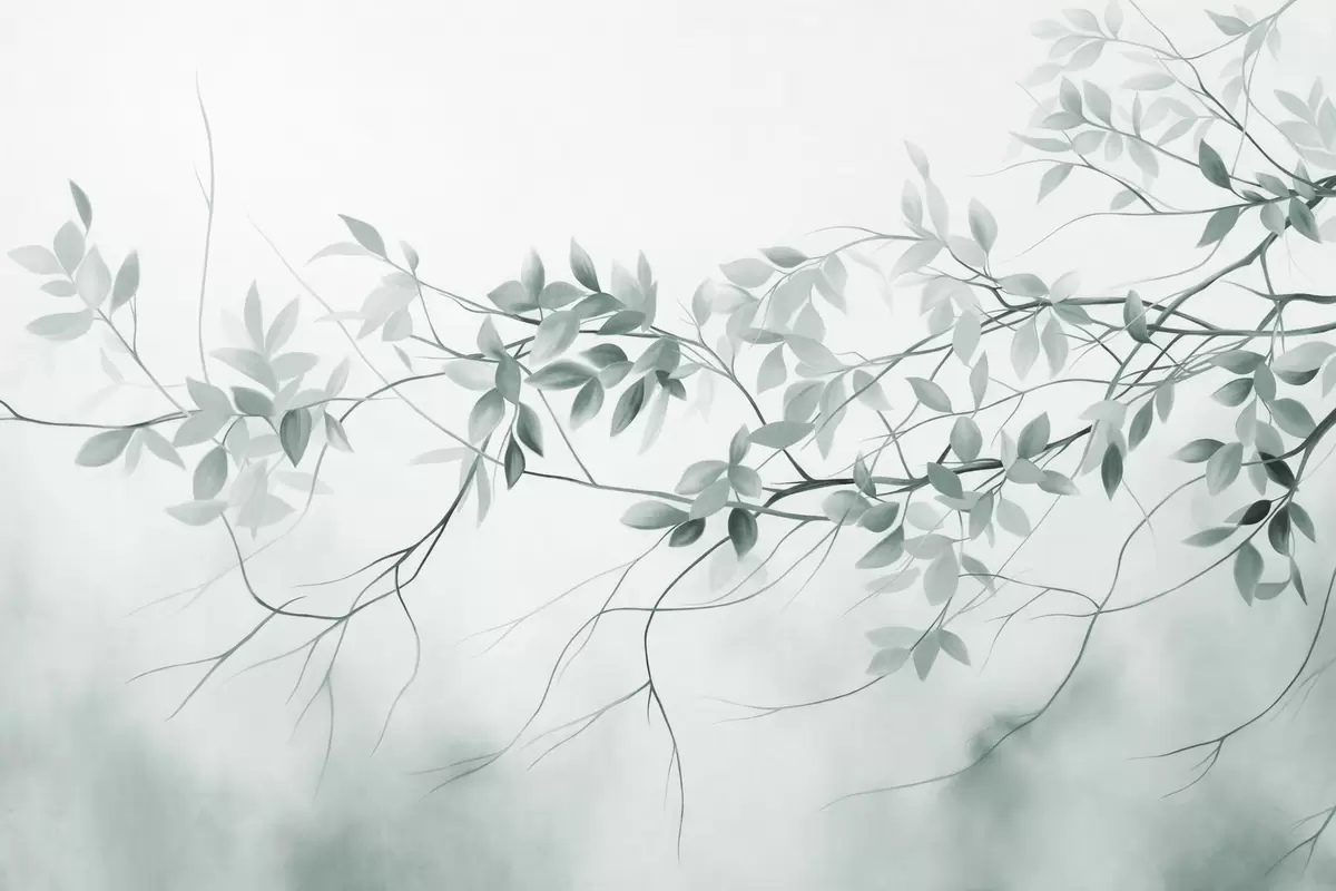 Fototapeedid Õrnad tekstuuriga oksad, millel on tuhmid hallid ja rohelised lehed pehme, ähmane taustaga Nr w09336v1