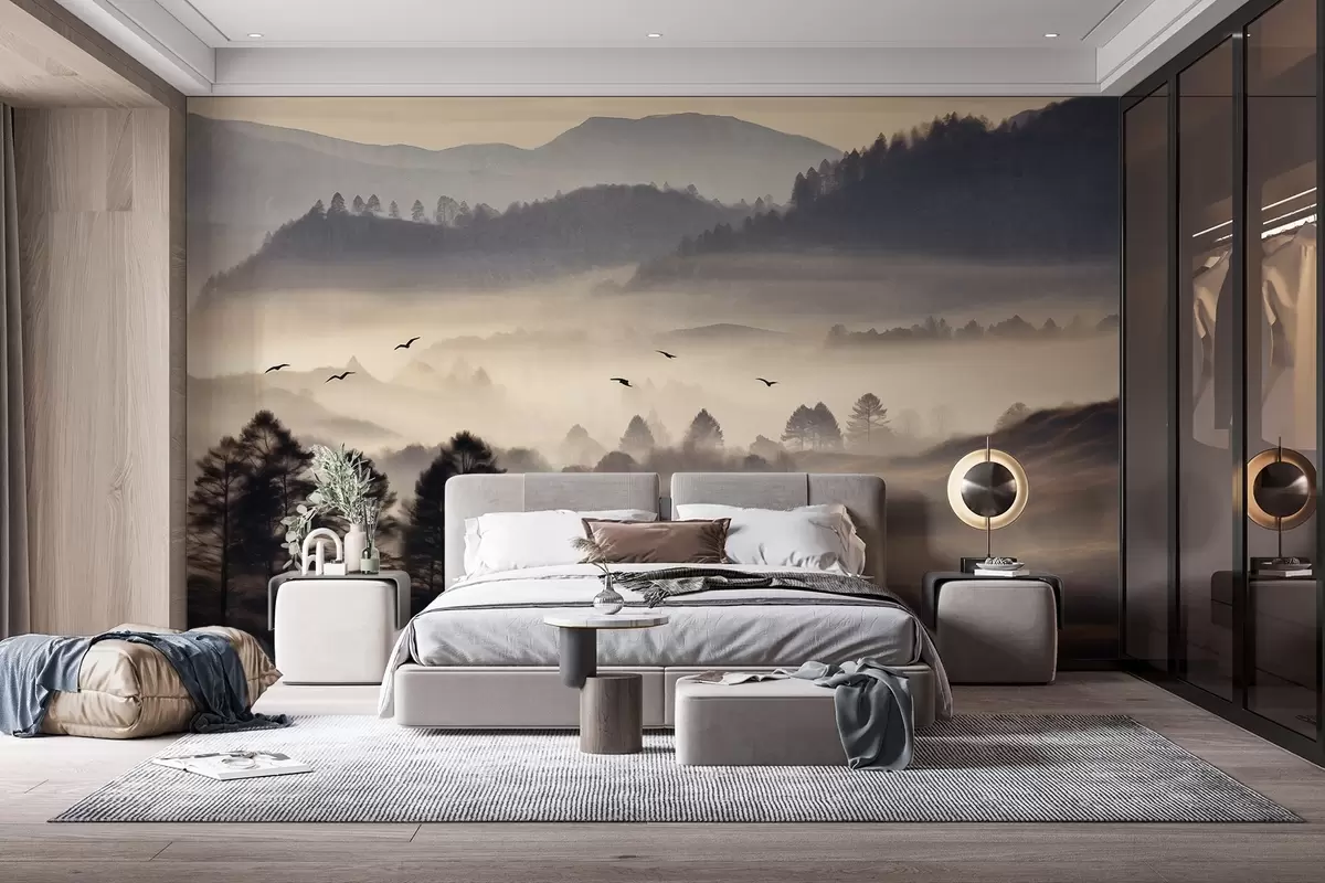 Fototapeedid Tekstuurne mägimaastik udukihiga, siluettpuud esiplaanil, kaugel asuv mäeahelik, pehme valgustus Nr w09338