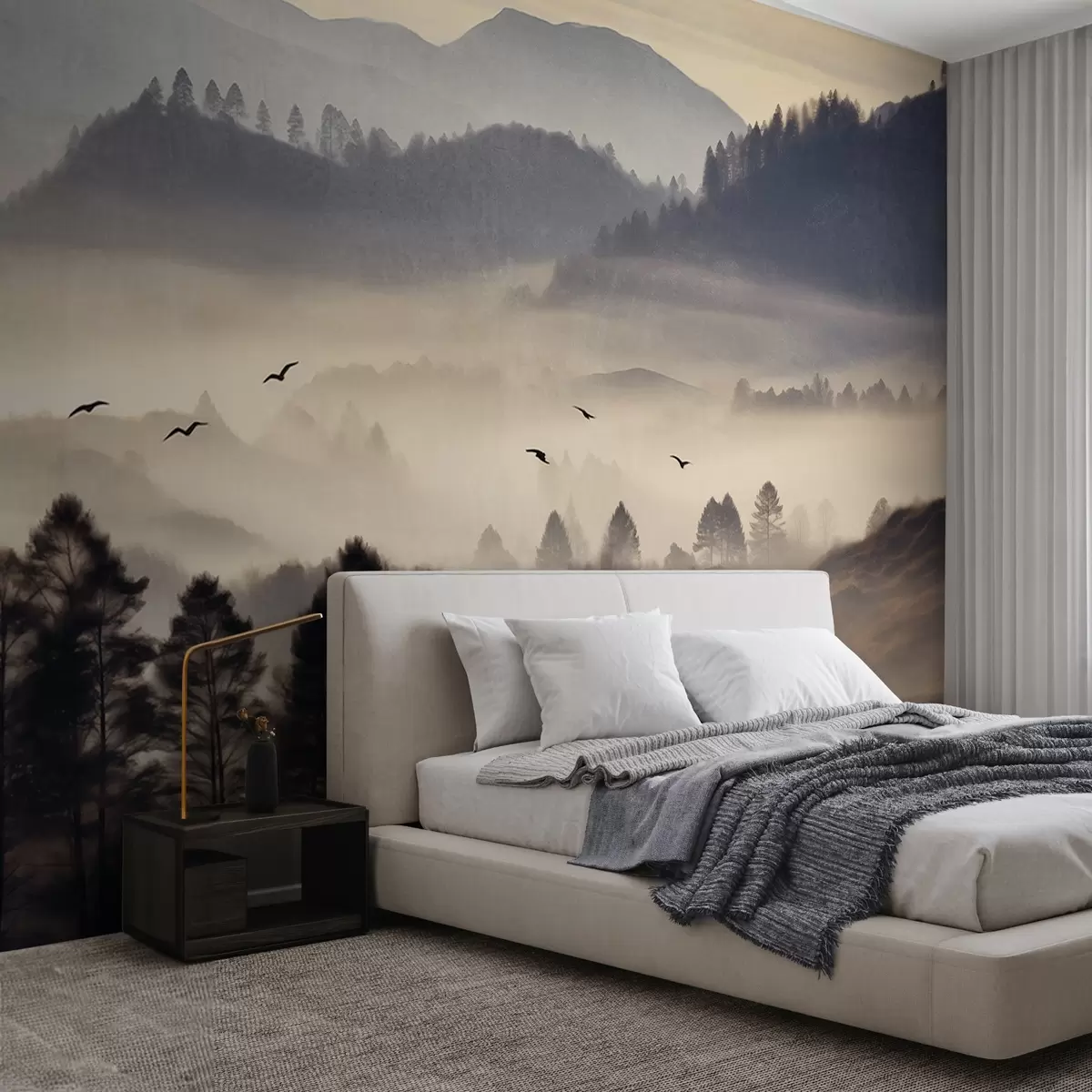 Fototapeedid Tekstuurne mägimaastik udukihiga, siluettpuud esiplaanil, kaugel asuv mäeahelik, pehme valgustus Nr w09338