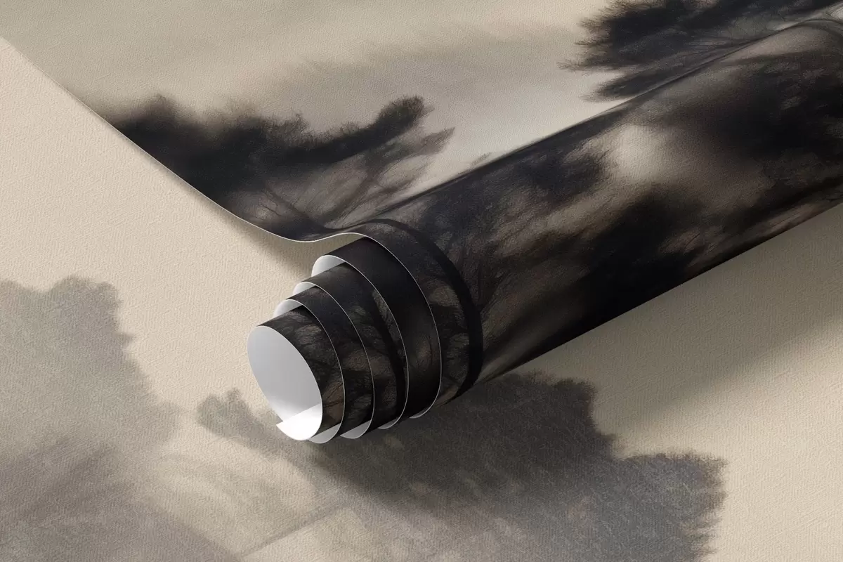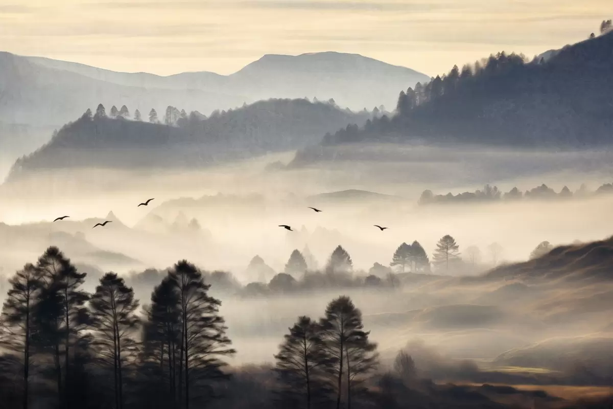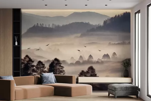 Fototapeedid Tekstuurne mägimaastik udukihiga, siluettpuud esiplaanil, kaugel asuv mäeahelik, pehme valgustus Nr w09338