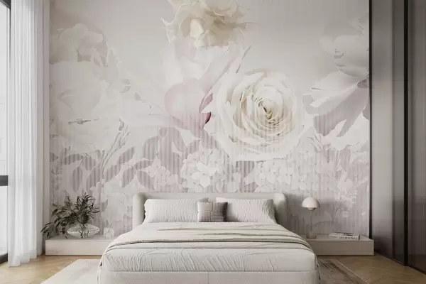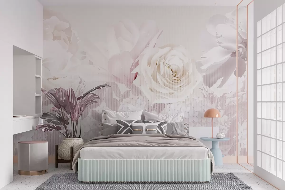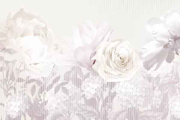 Fototapeedid Lilleseade, milles on roosid, hortensiad ja tulbid valge, roosa ja beeži pehme pastelsetes toonides, triibulise tekstuuriga Nr w09340