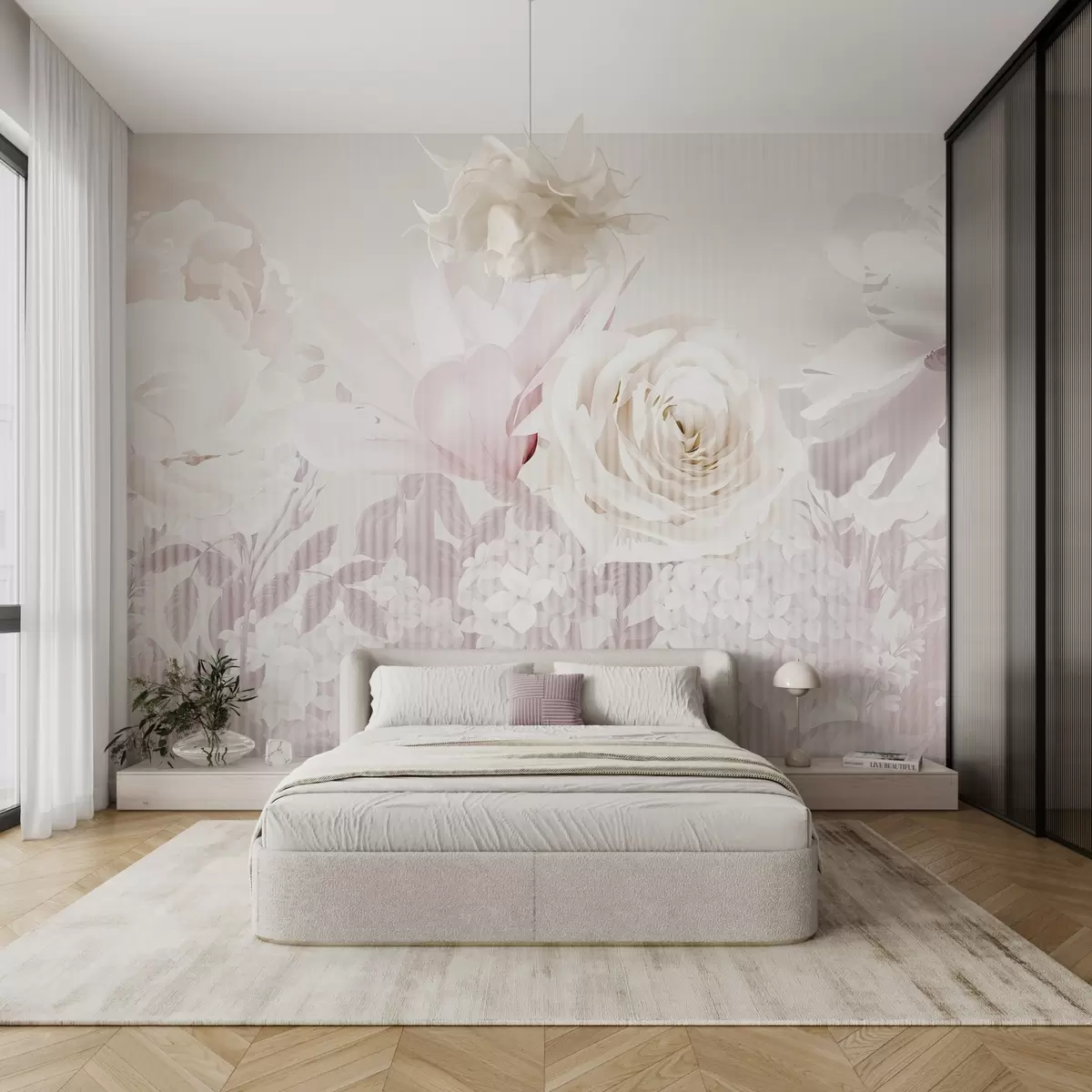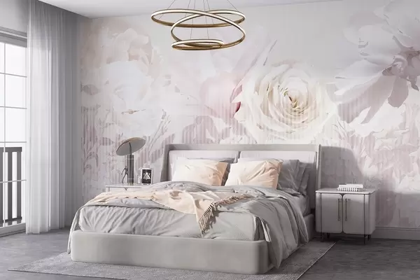 Fototapeedid Lilleseade, milles on roosid, hortensiad ja tulbid valge, roosa ja beeži pehme pastelsetes toonides, triibulise tekstuuriga Nr w09340