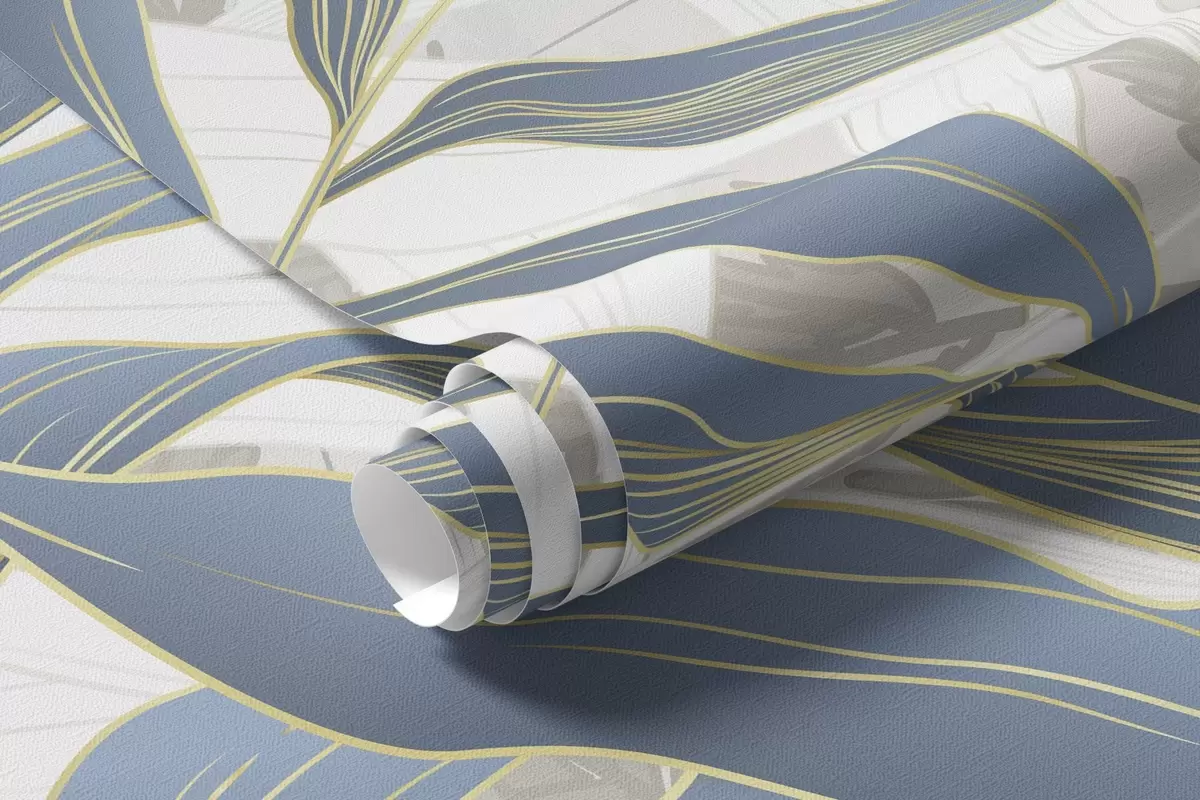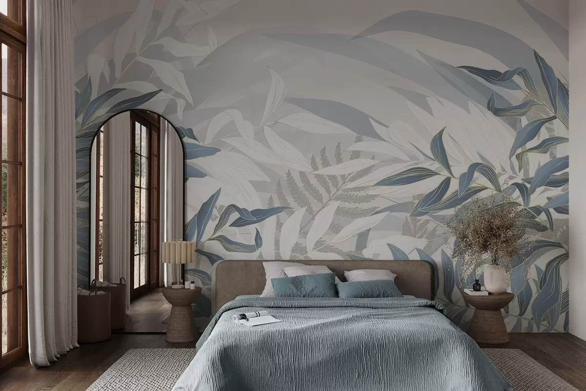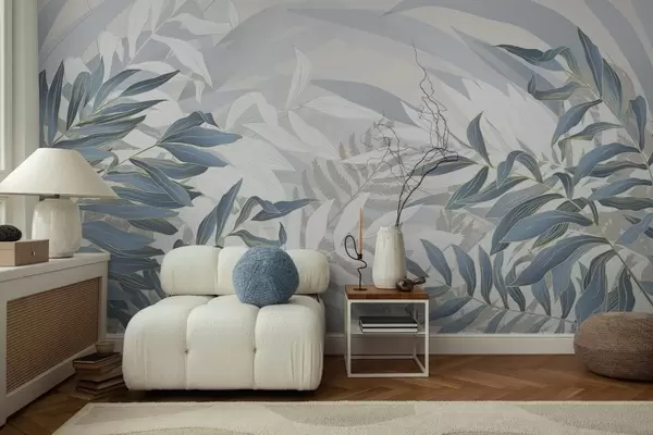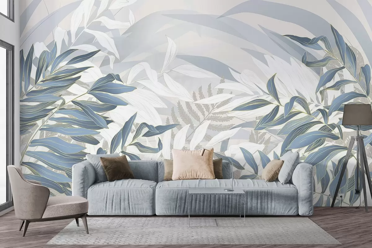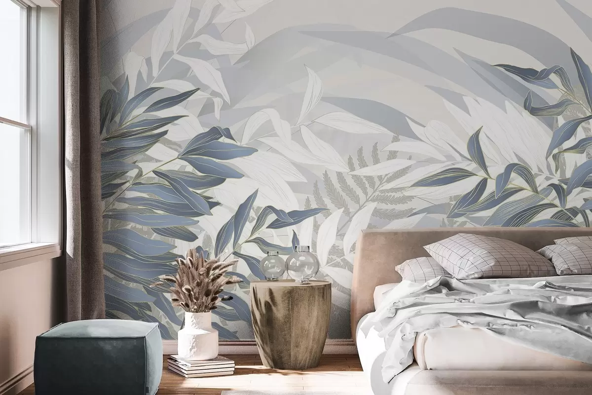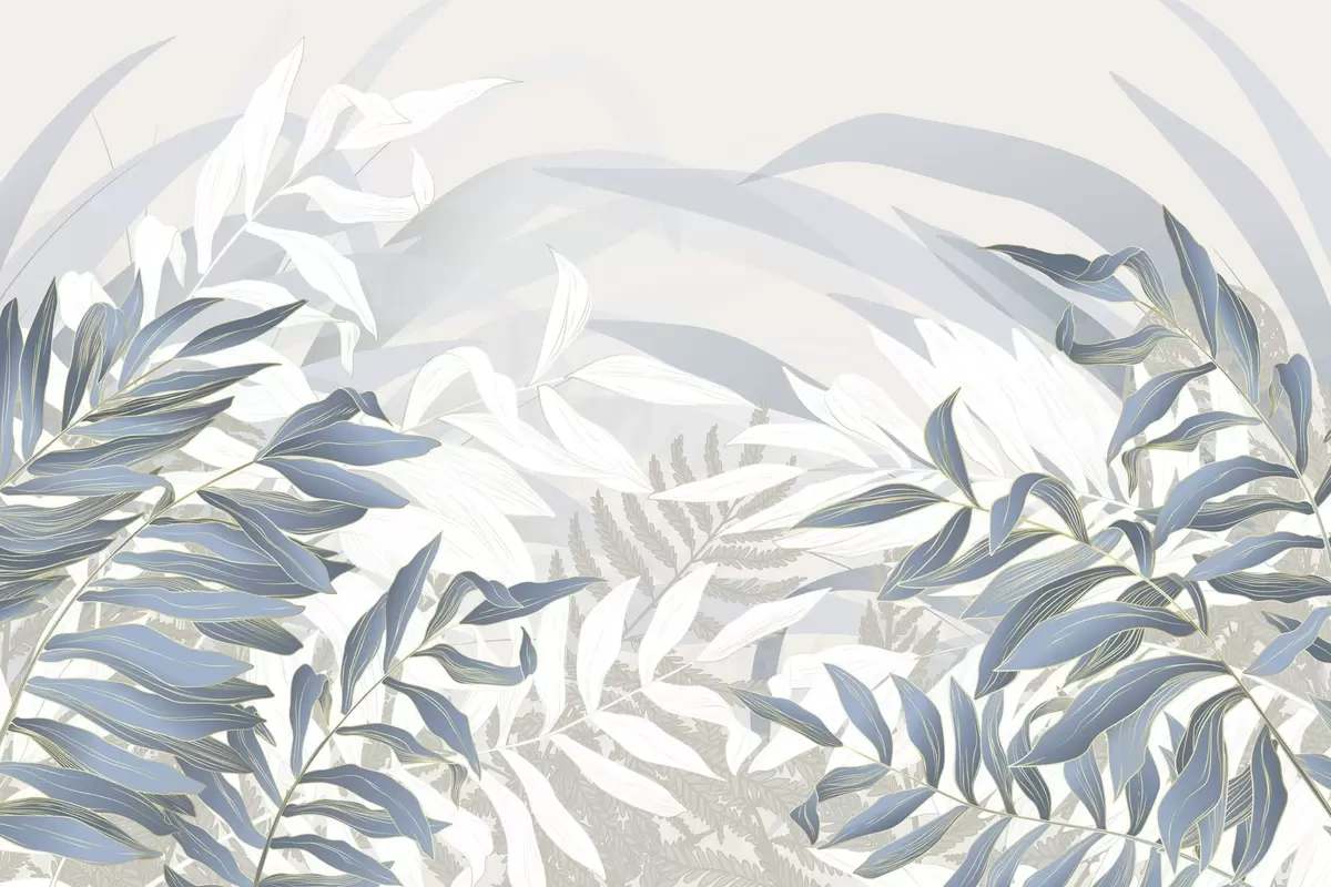 Fototapeedid Sinised ja valged lehed ja rohi, pehmed pastelsed värvid, botaaniline illustratsioon, minimalistlik disain, dekoratiivne, kaasaegne Nr w09341
