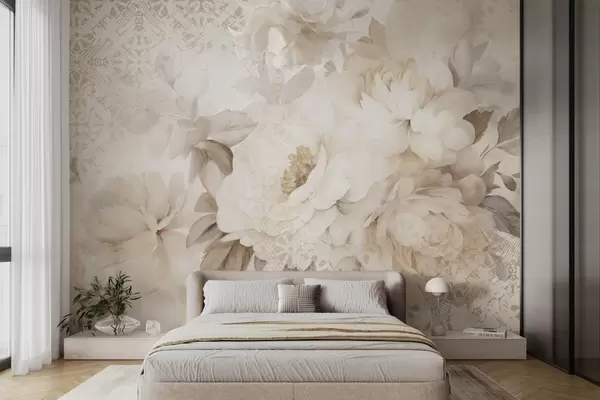 Fototapeedid Lillekomplekt valgetest pioonidest koos beežide lehtedega, mis on asetatud vintage-tekstuuriga dekoratiivsele taustale Nr w09345