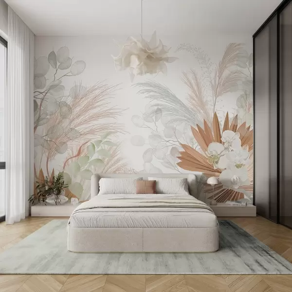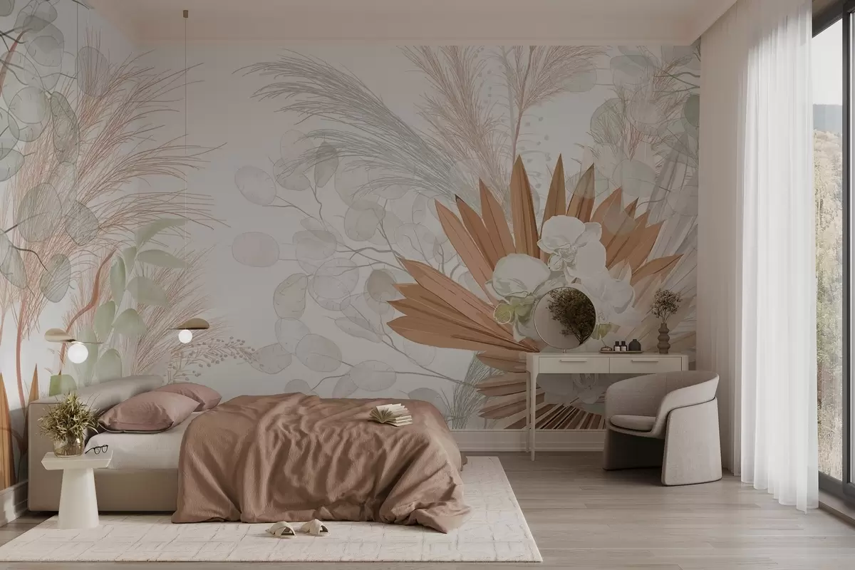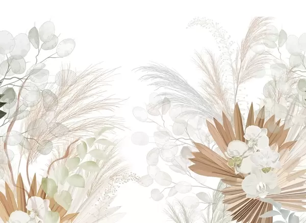 Fototapeedid Pampasrohi, eukalüptus, troopilised lehed ja orhideed valgel taustal, pastelltoonides Nr w09366