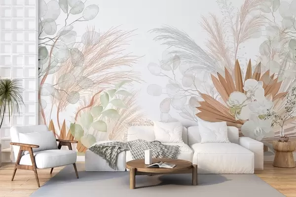 Fototapeedid Pampasrohi, eukalüptus, troopilised lehed ja orhideed valgel taustal, pastelltoonides Nr w09366