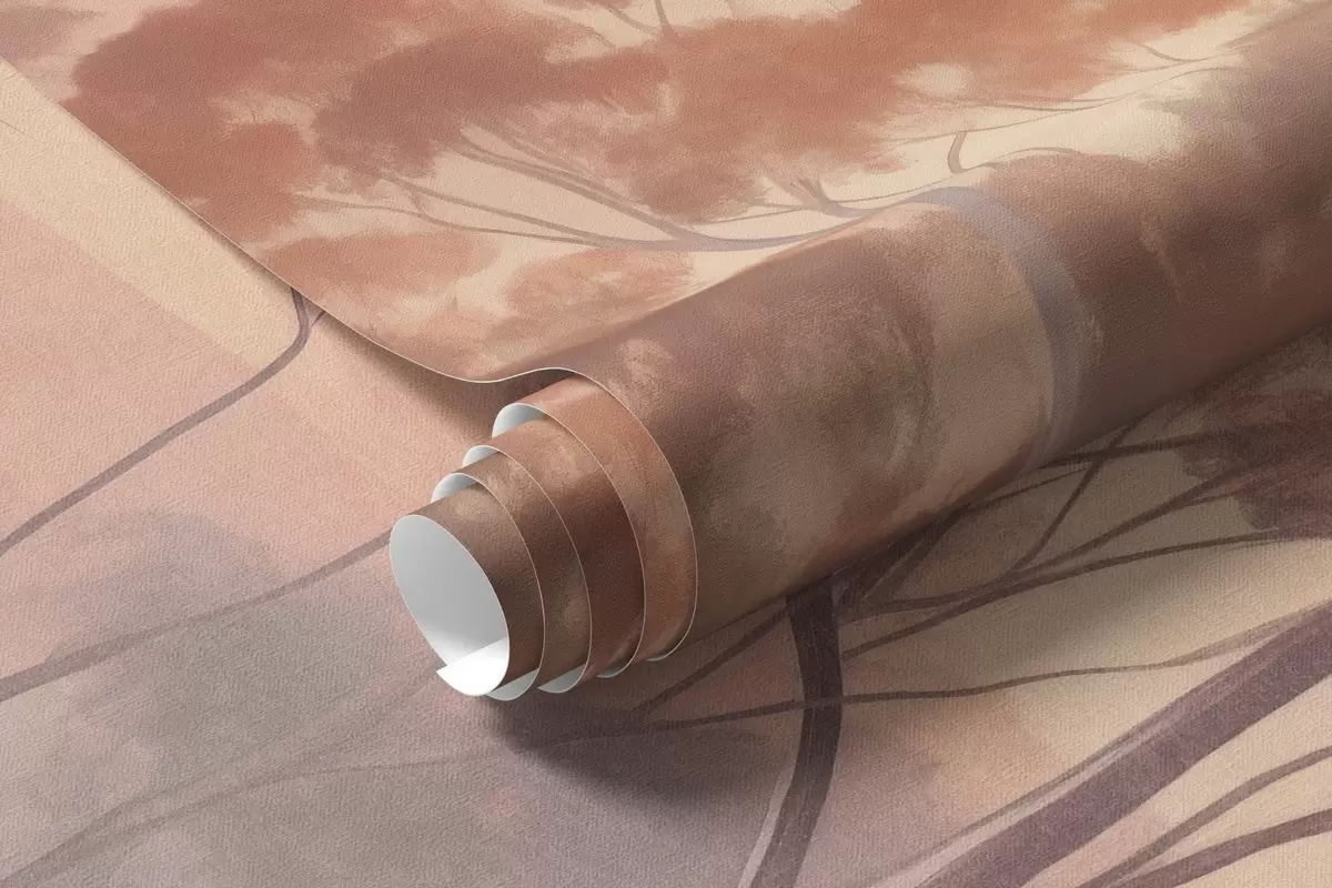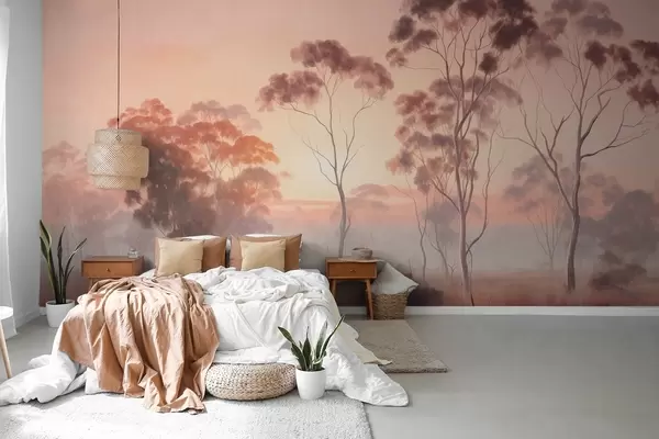 Fototapeedid Maastik eukalüptipuudega põllul, millel on pastellroosa ja oranž taevas, kerge udu, maali tekstuurne stiil Nr w09367