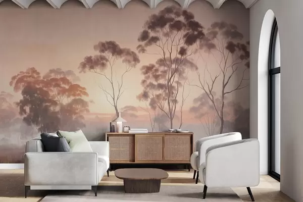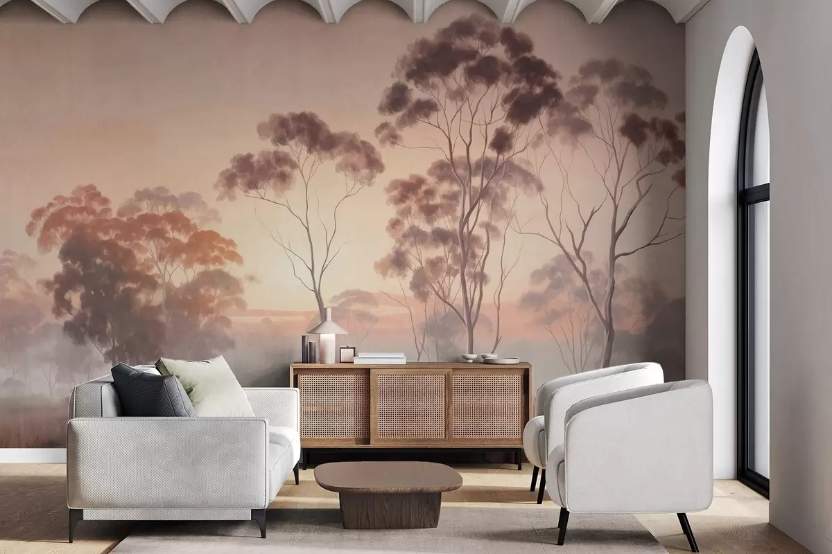 Fototapeedid Maastik eukalüptipuudega põllul, millel on pastellroosa ja oranž taevas, kerge udu, maali tekstuurne stiil Nr w09367