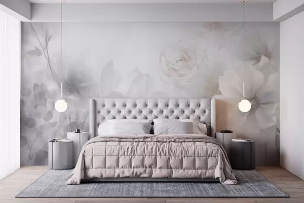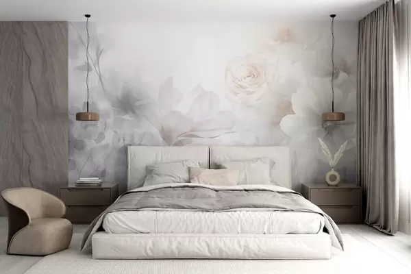 Fototapeedid Õrn abstraktne lilleseade pastellroosade rooside ja magnooliadega, pehme fookus, helehall taustaga Nr w09371