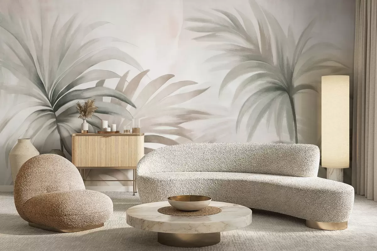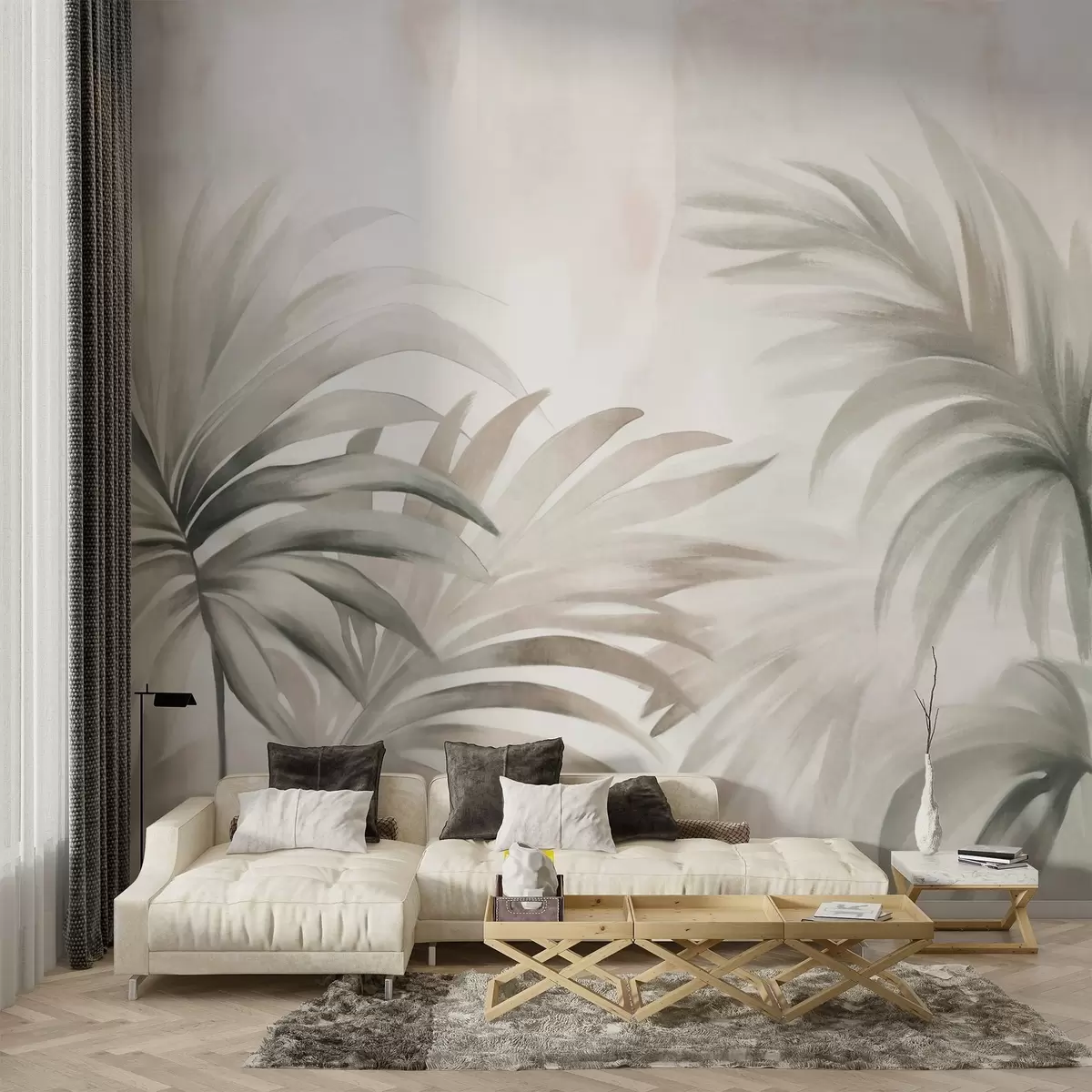 Fototapeedid Palmipuu tekstureeritud lehed neutraalsetes värvides, beež abstraktne taust, pehmed pintslitõmbed, troopiline tekstureeritud lehestik Nr w09380