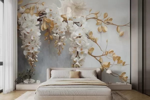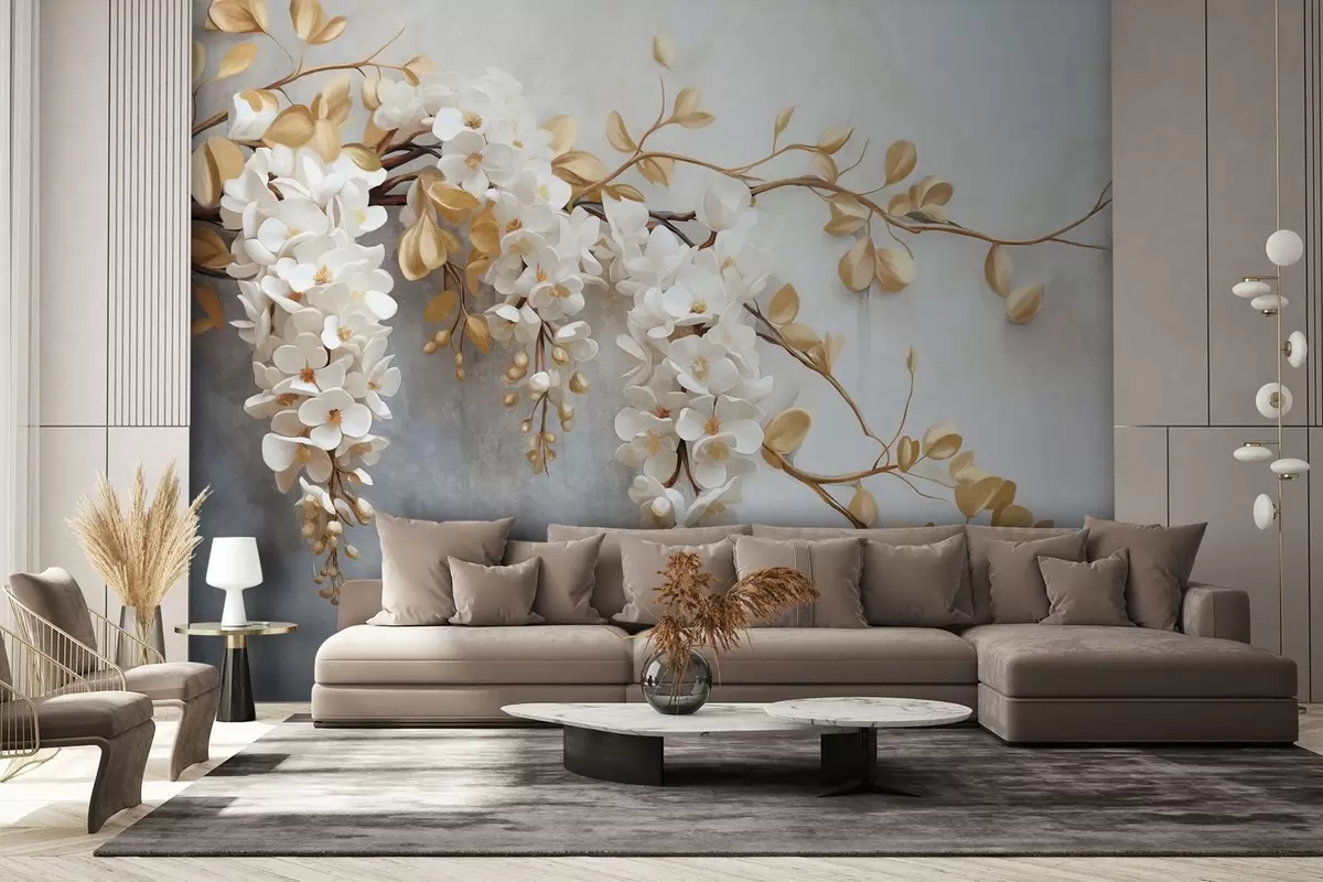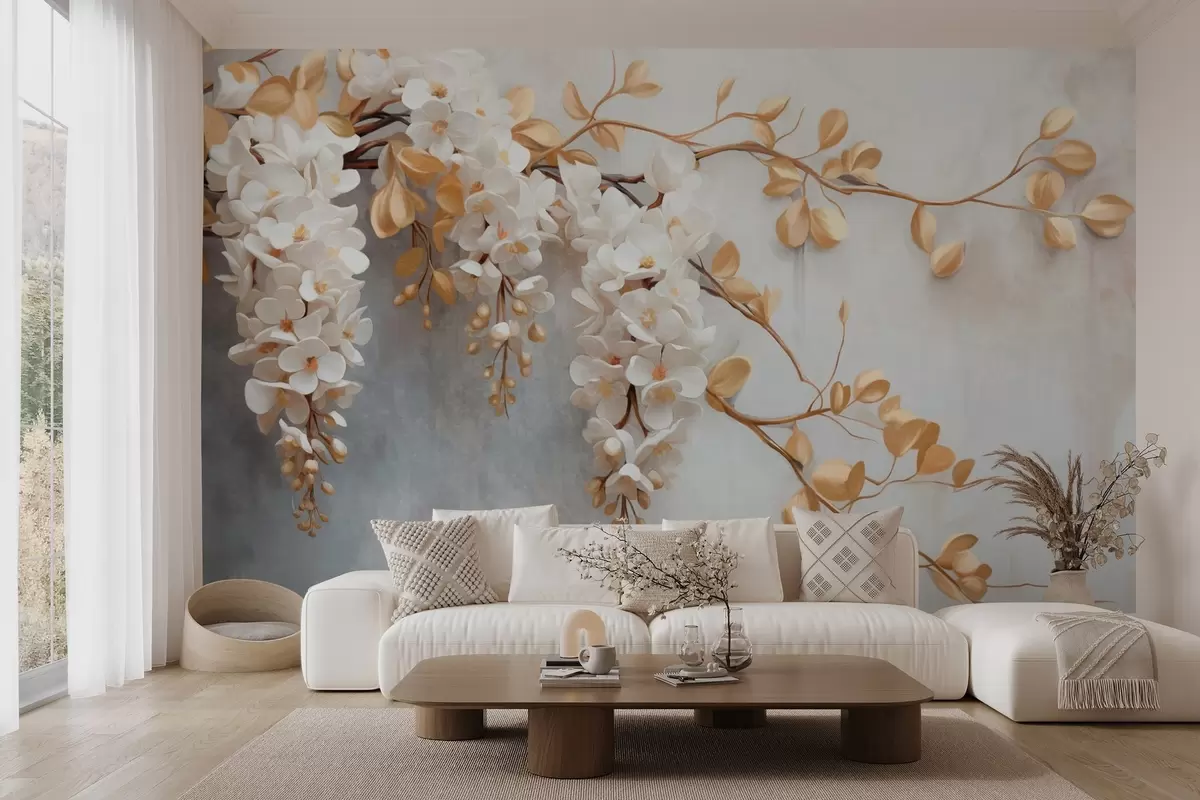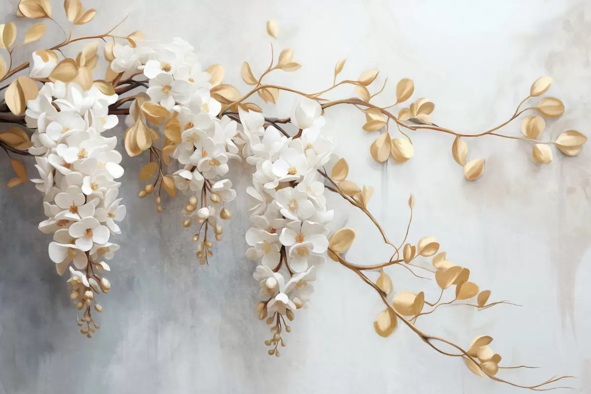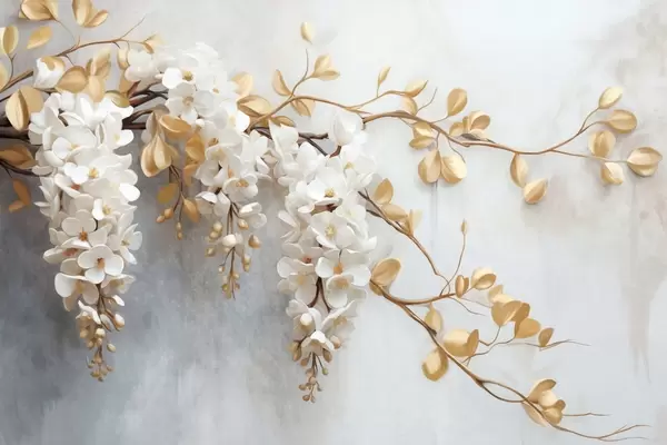 Fototapeedid Valged visteria õied kollaste lehtedega oksal, mis langevad alla valge tekstuuriga taustal, õrnade kroonlehtedega Nr w09381