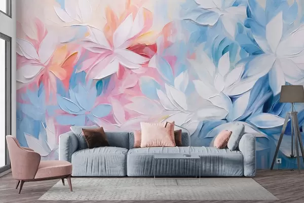 Fototapeedid Valged tekstuuriga lilled roosa ja siniste lehtedega, õlimaal abstraktses stiilis, pehmed pintslitõmbed, pastellvärvid Nr w09396
