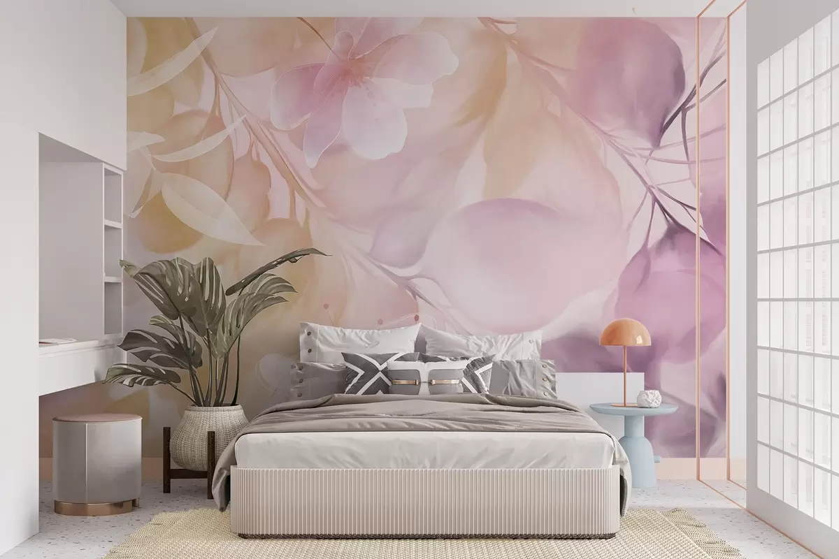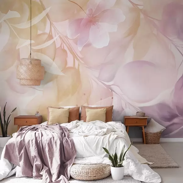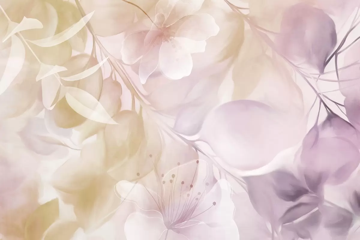 Fototapeedid Lilleline kunst, milles on kasutatud vaoshoitud kollaseid ja lillakaid lilli, lehti ja oksi, pehmeid pastelltoone ning akvarellist tekstuuri Nr w09397v2