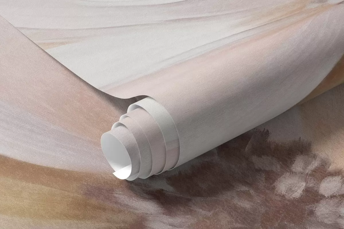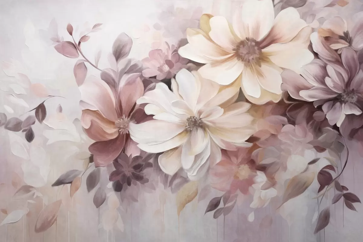 Fototapeedid Lilleseade suurte tekstuuriga pehmevärviliste lilledega burgundia, virsiku ja valge toonides, õrnad lehed Nr w09398