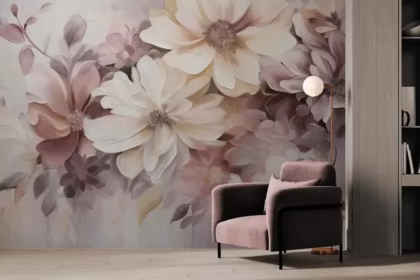 Fototapeedid Lilleseade suurte tekstuuriga pehmevärviliste lilledega burgundia, virsiku ja valge toonides, õrnad lehed Nr w09398