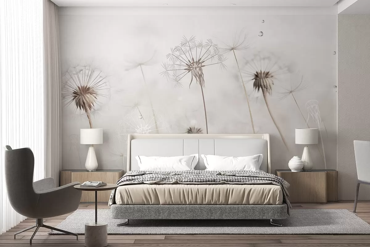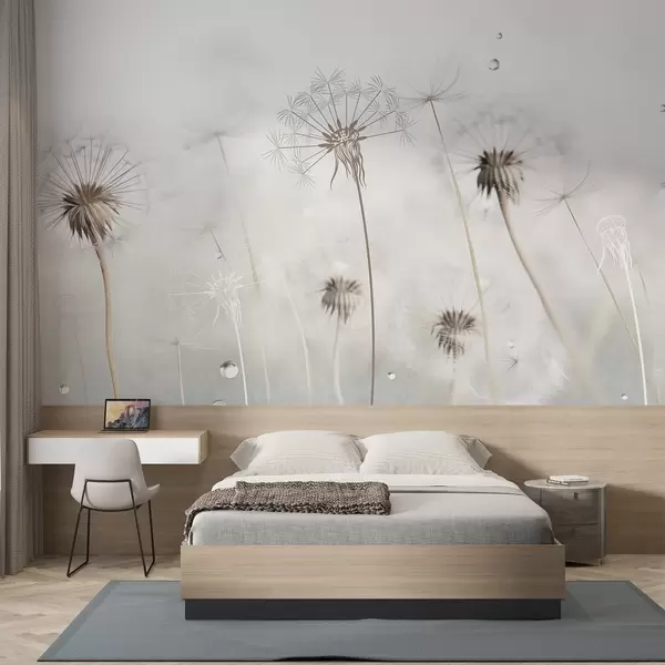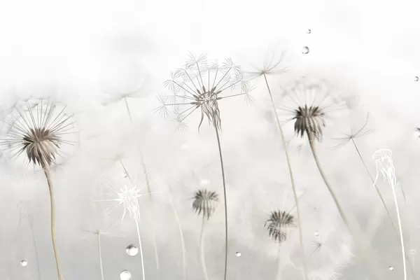 Fototapeedid Vesi tilkadega võililled, valge taust, lähivõte, pehme valgus, loodus, botaanika, õhuline, delikaatne, minimalistlik Nr w09399