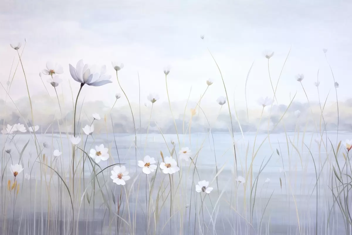 Fototapeedid Valged lilled pikkade vartega põllul, helesinine taevas, pehmed värvid, tekstuurne, minimalistlik stiil, loodusest inspireeritud, rahulik taust Nr w09401