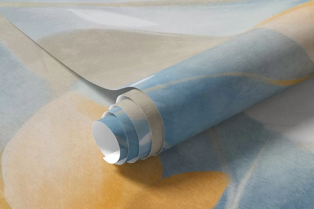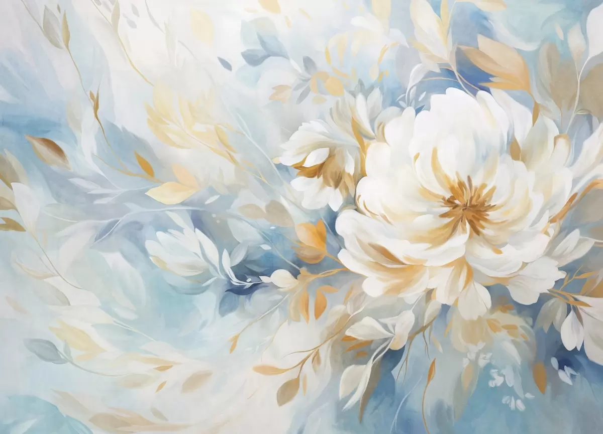 Fototapeedid Tekstuuriga valge lill siniste ja kollaste detailide ja lehtedega sinisel ja valgel abstraktsel taustal, maalistiilis Nr w09403