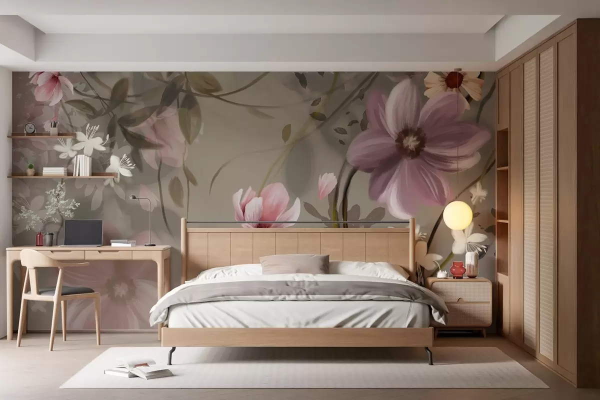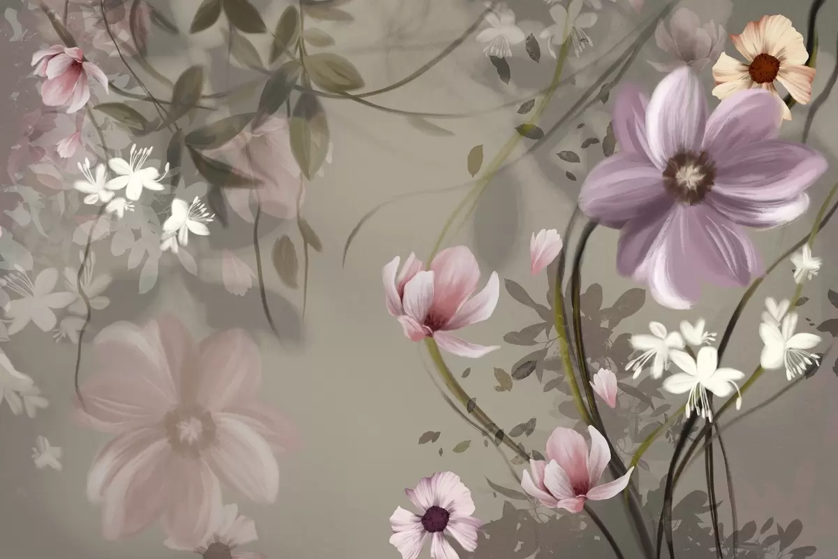 Fototapeedid Roosad ja valged lilled pruunide varte ja lehtedega, pehme valgustus, summutatud värvid, lillekimp Nr w09417