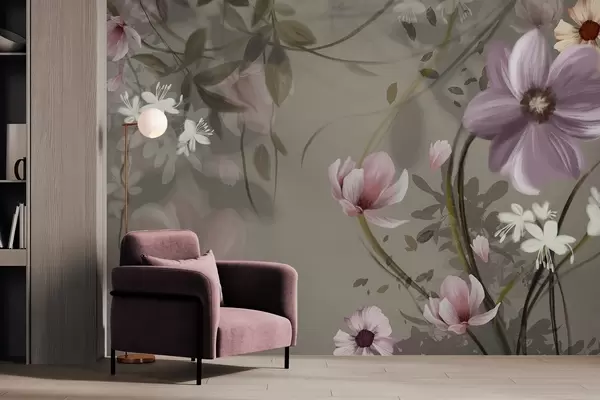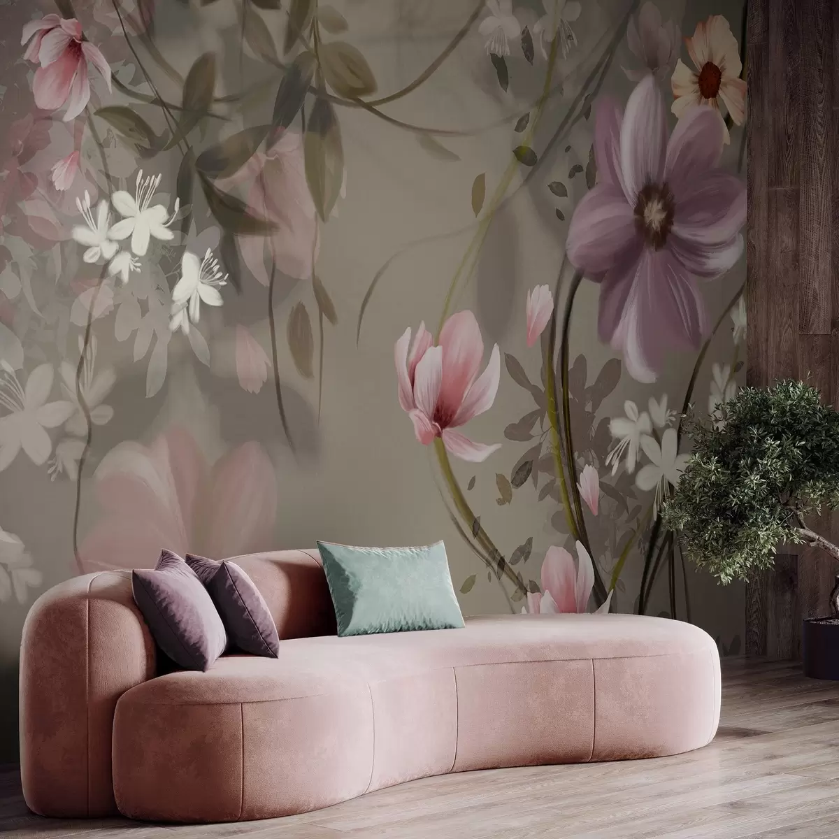 Fototapeedid Roosad ja valged lilled pruunide varte ja lehtedega, pehme valgustus, summutatud värvid, lillekimp Nr w09417