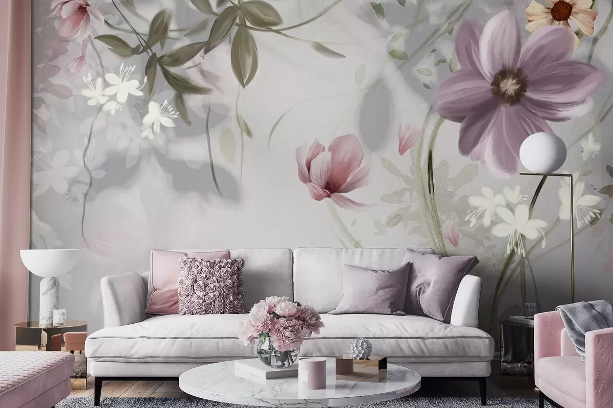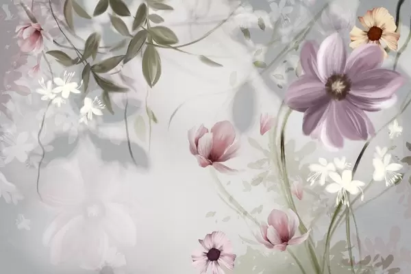 Fototapeedid Roosa ja valged lilled roheliste varte ja lehtedega, pehme valgustus, summutatud värvid, lillekimp Nr w09417v1