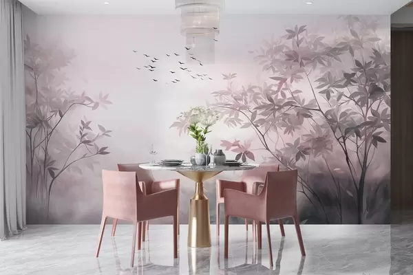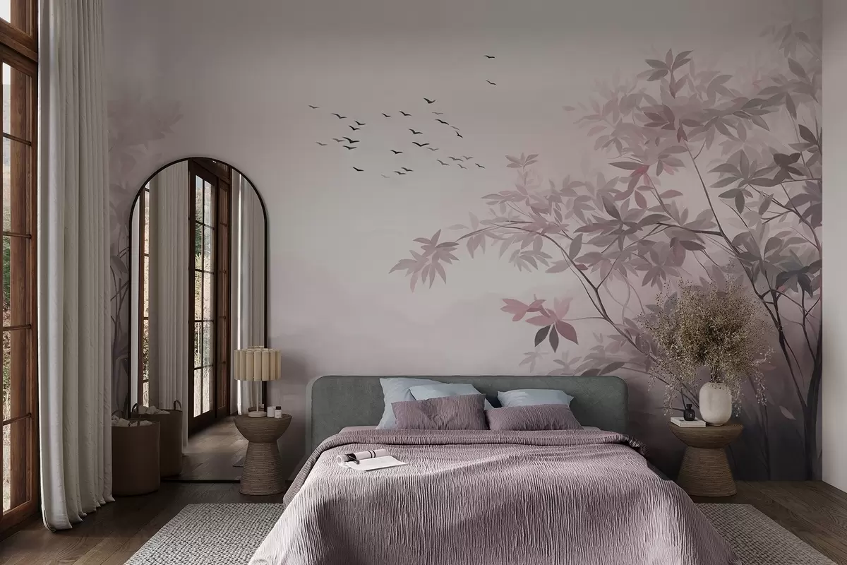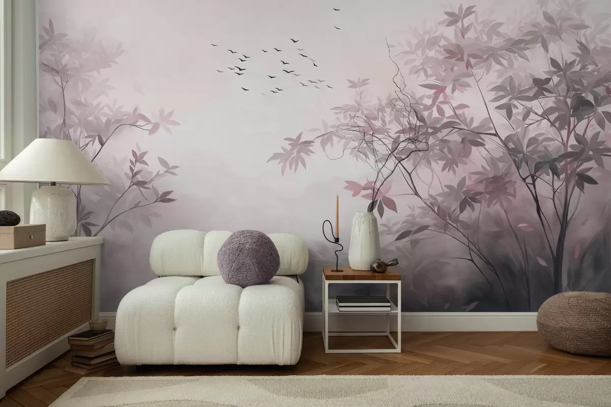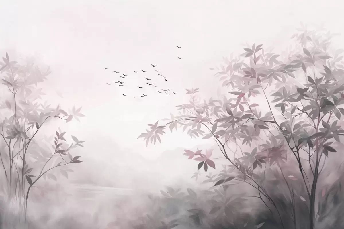 Fototapeedid Tekstuuriga maastik puude ja taevas lendava linnuparvega, pastellvärvid, loodusvaade Nr w09418v1