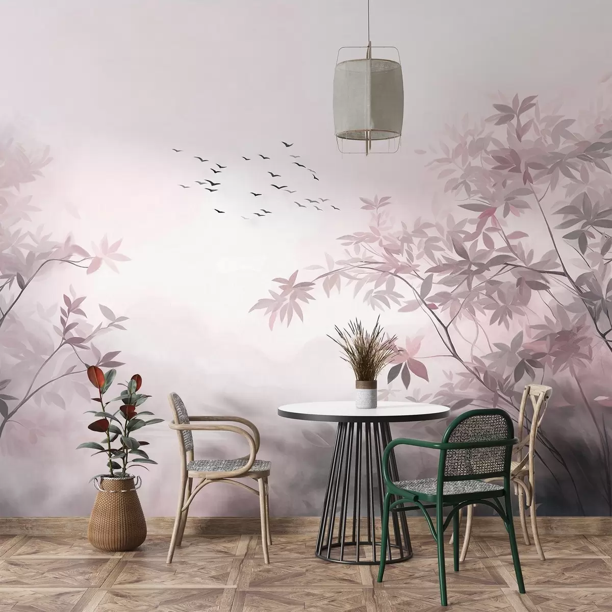Fototapeedid Tekstuuriga maastik puude ja taevas lendava linnuparvega, pastellvärvid, loodusvaade Nr w09418v1