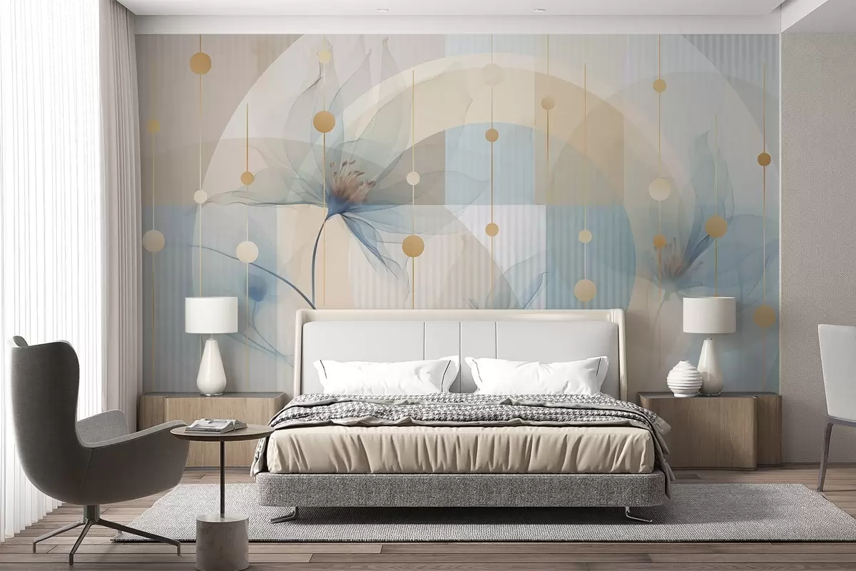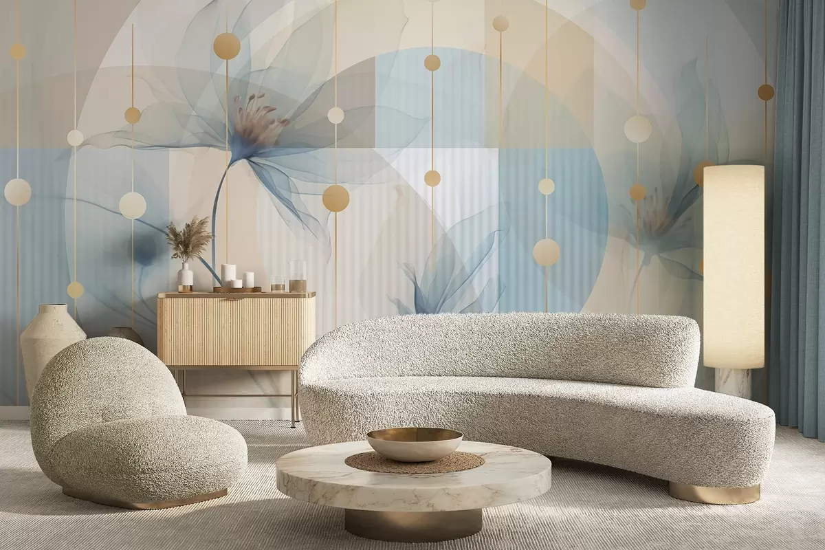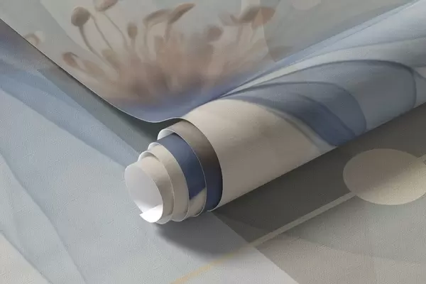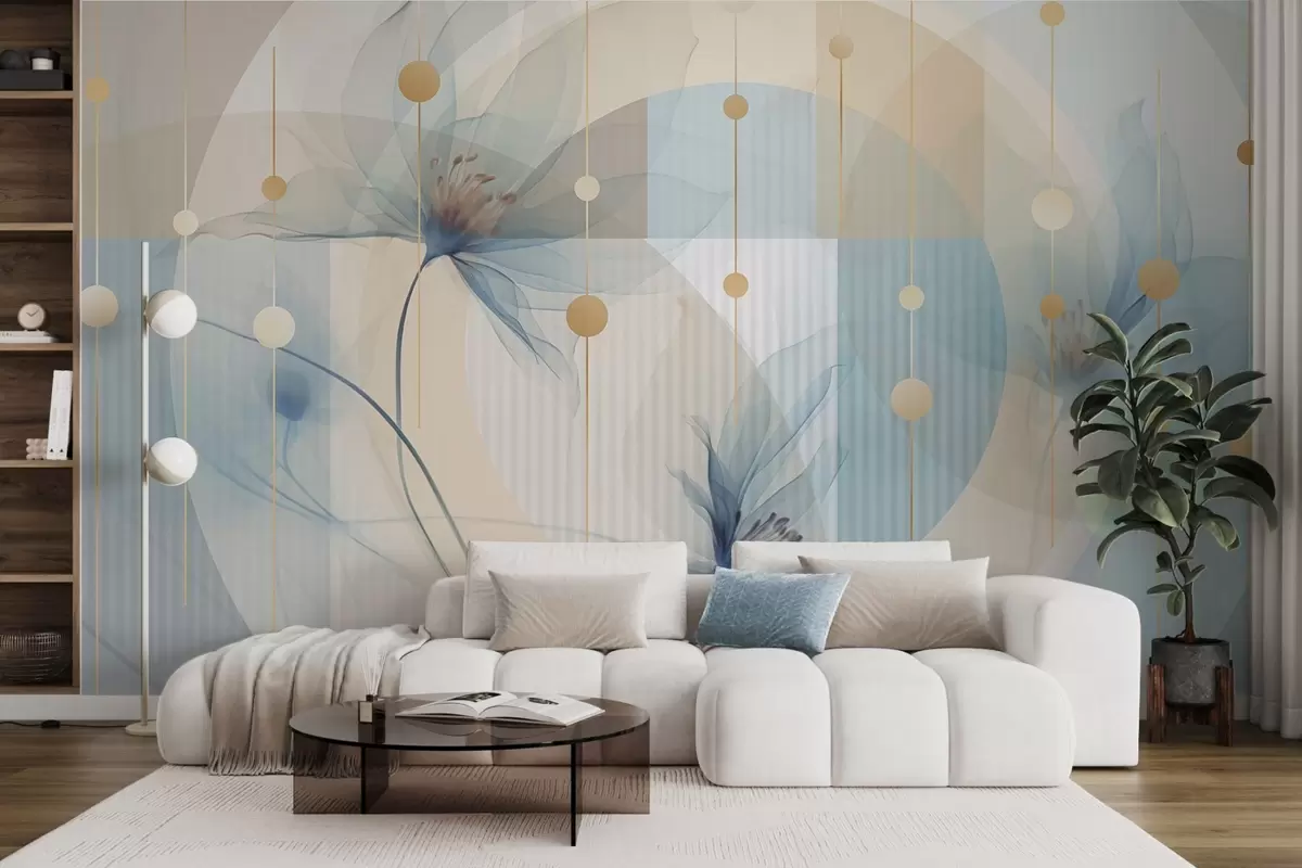 Fototapeedid Abstraktsed läbipaistvad lilled, ringid ja geomeetrilised kujundid, pastellsinine, beež ja valge värvipalett Nr w09419