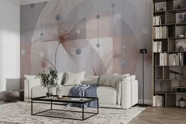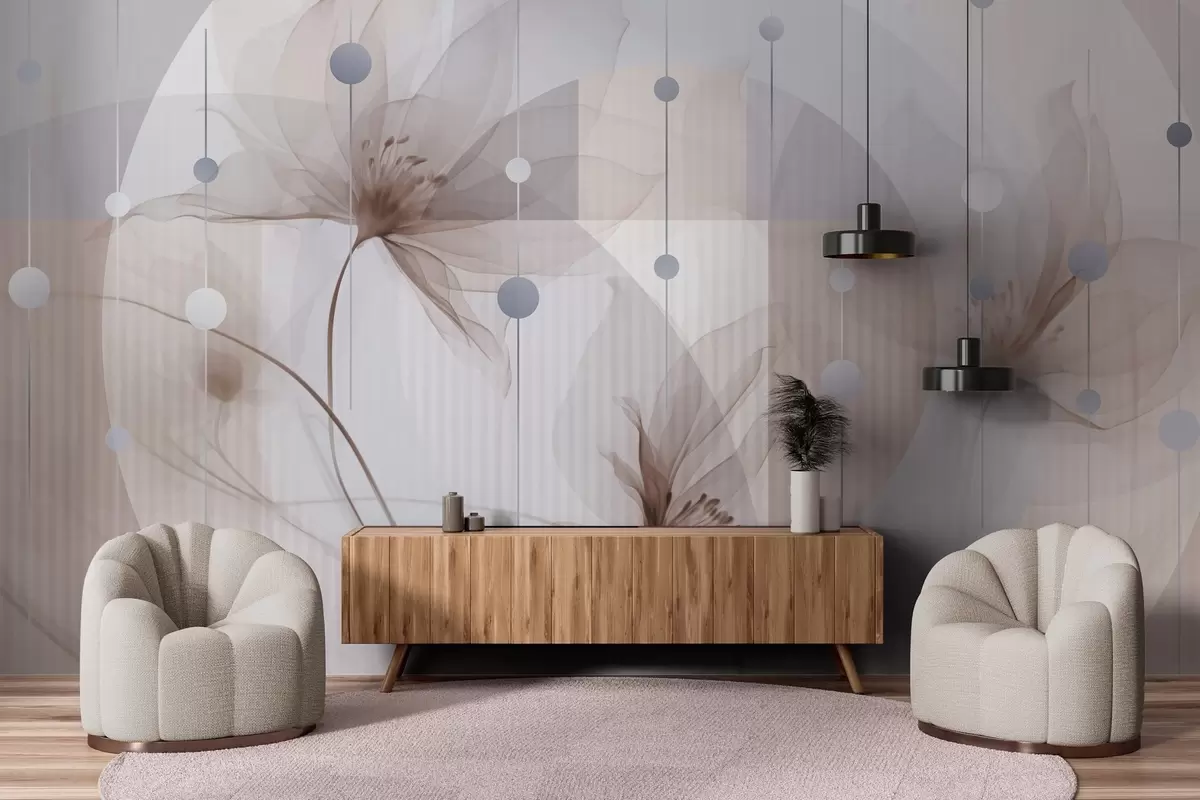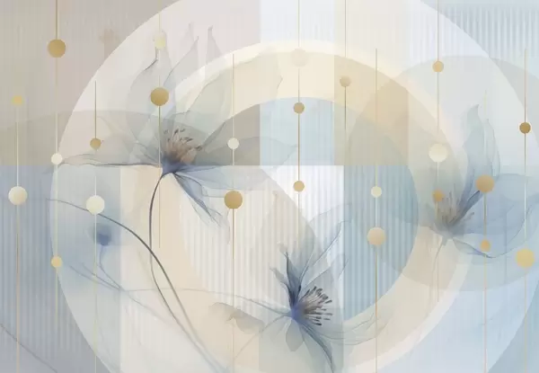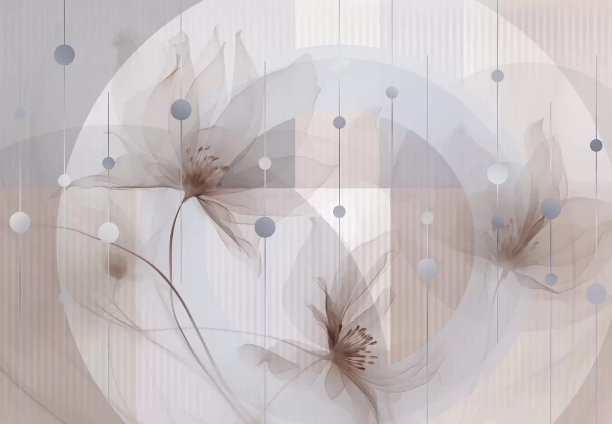 Fototapeedid Abstraktsed läbipaistvad lilled, ringid ja geomeetrilised kujundid, pastellsinine, pruun ja valge värvipalett Nr w09419v1
