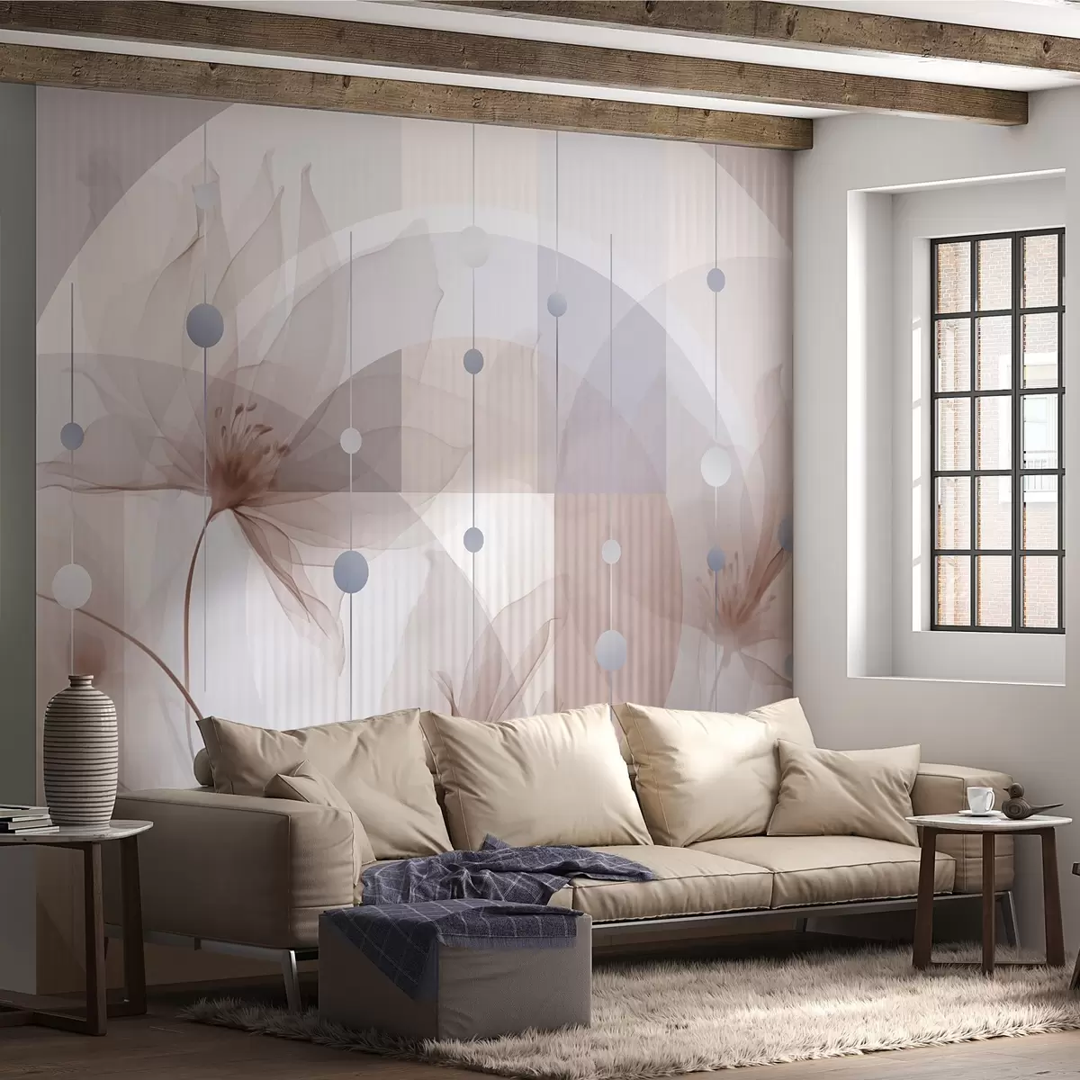 Fototapeedid Abstraktsed läbipaistvad lilled, ringid ja geomeetrilised kujundid, pastellsinine, pruun ja valge värvipalett w09419v1