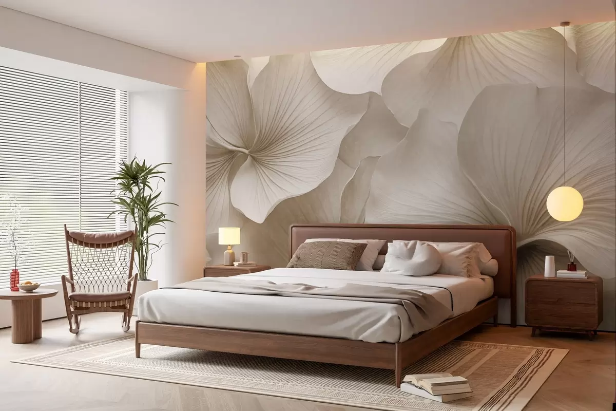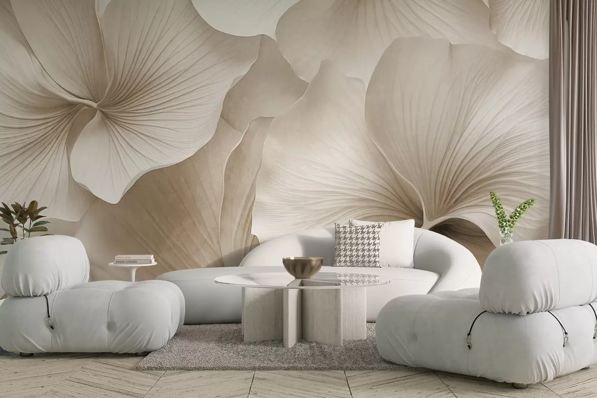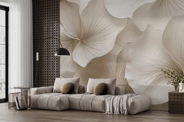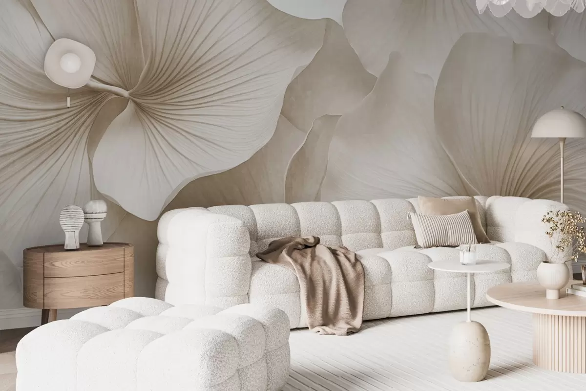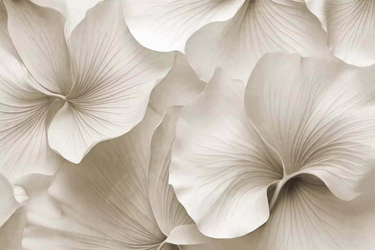 Fototapeedid Valged ja beežid hõlmikpuu lehed, pehme tekstuuriga, abstraktne lillemustriga taust, minimalistlik modernne stiil Nr w09421v1