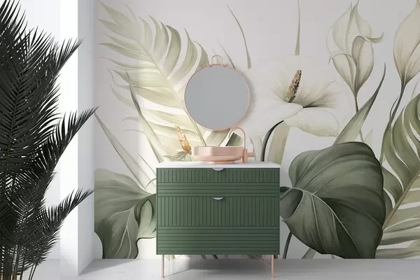 Fototapeedid Valged kala liljad ja rohelised troopilised lehed, botaaniline illustratsioon, hele taust, vintage stiil, tekstuuriga Nr w09423