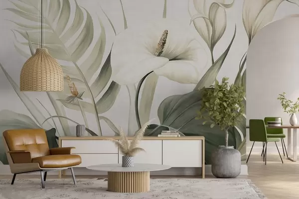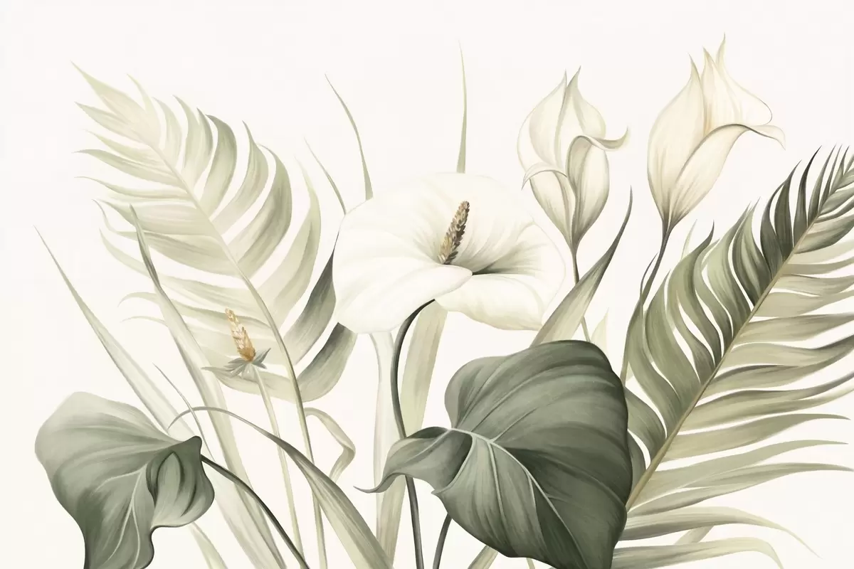 Fototapeedid Valged kala liljad ja rohelised troopilised lehed, botaaniline illustratsioon, hele taust, vintage stiil, tekstuuriga Nr w09423