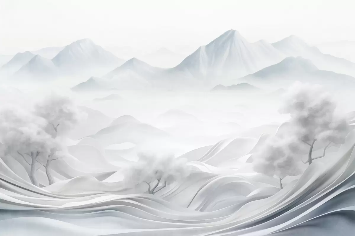 Fototapeedid Lumine abstraktne dekoratiivne mägimaastik valgetega puude ja uduga, minimalistlik tekstuuriga stiil Nr w09426
