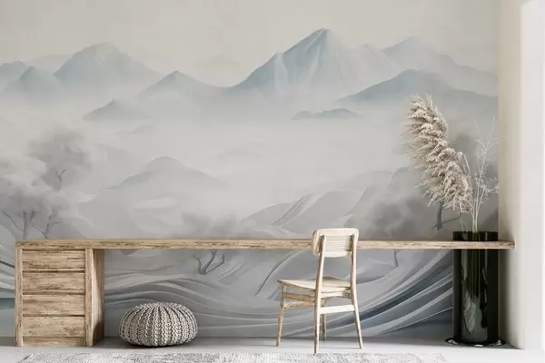Fototapeedid Lumine abstraktne dekoratiivne mägimaastik valgetega puude ja uduga, minimalistlik tekstuuriga stiil Nr w09426