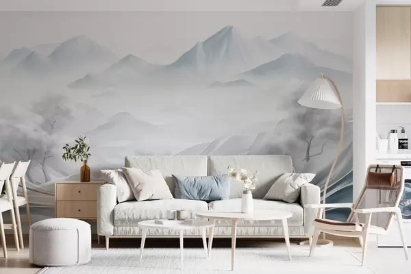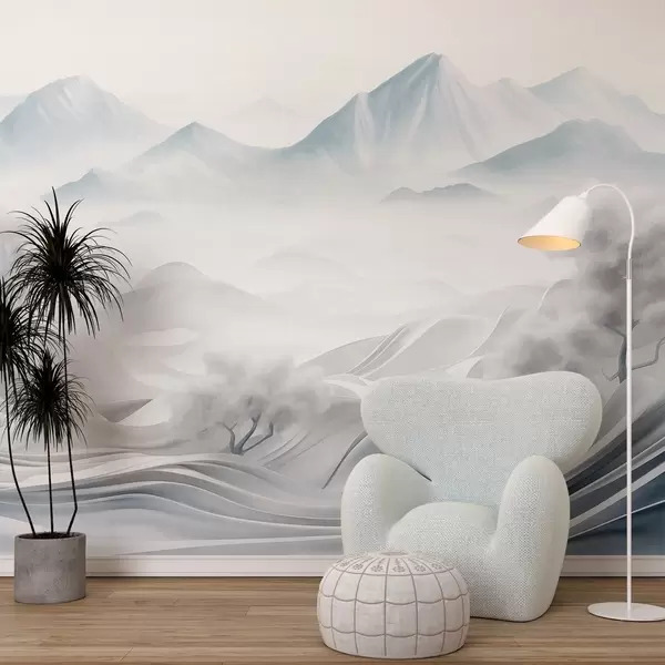 Fototapeedid Lumine abstraktne dekoratiivne mägimaastik valgetega puude ja uduga, minimalistlik tekstuuriga stiil Nr w09426