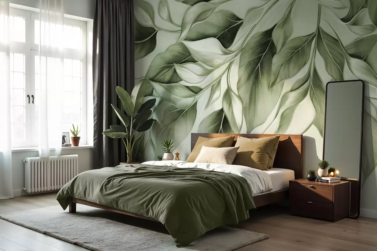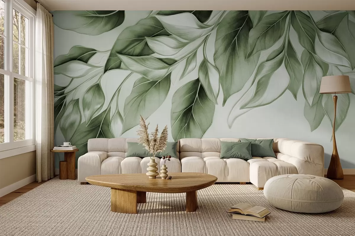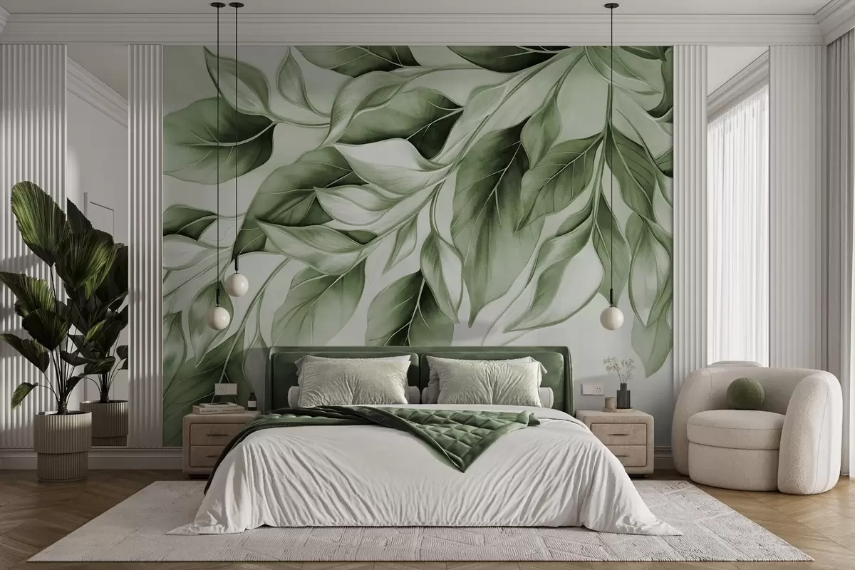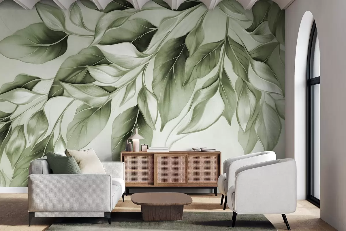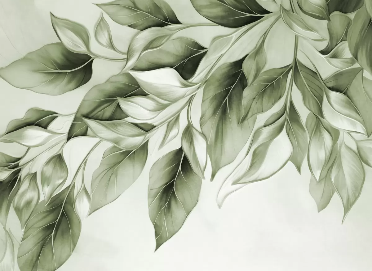 Fototapeedid Tekstuuriga tumerohelised lehed, hele taust, elegantne ja kunstiline disain, modernne stiil Nr w09429v1