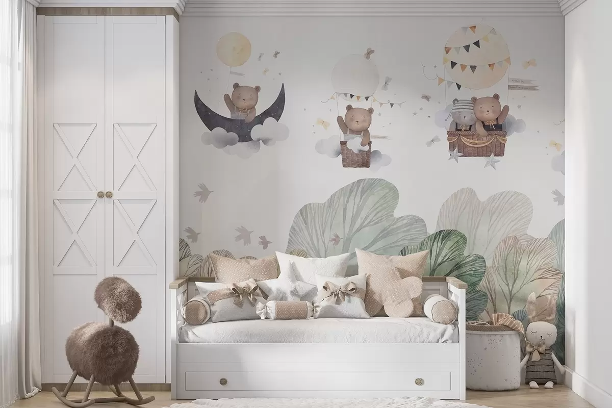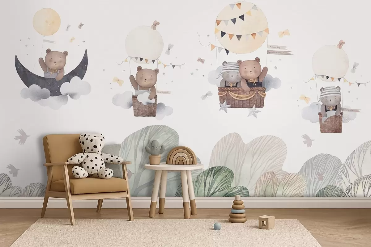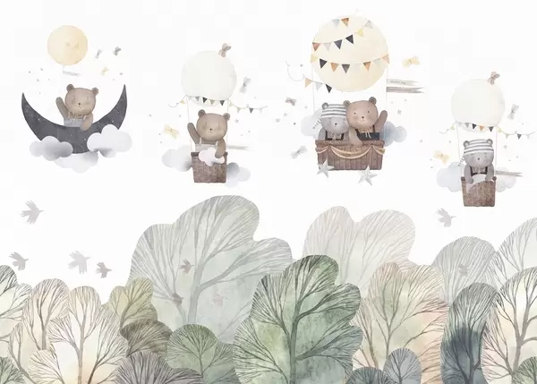Fototapeedid Akvarellstiilis õhupallid karudega metsa kohal Nr w09437