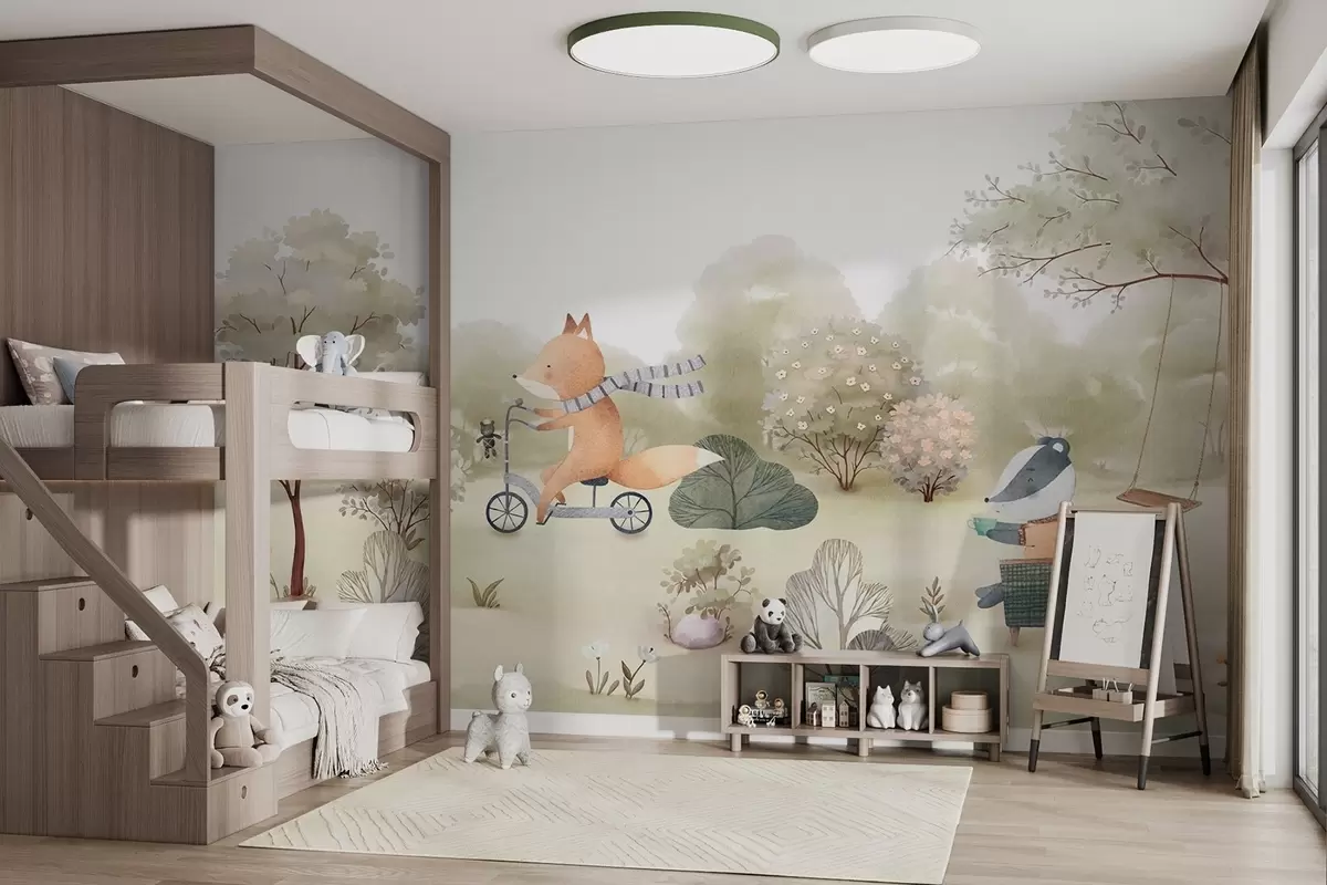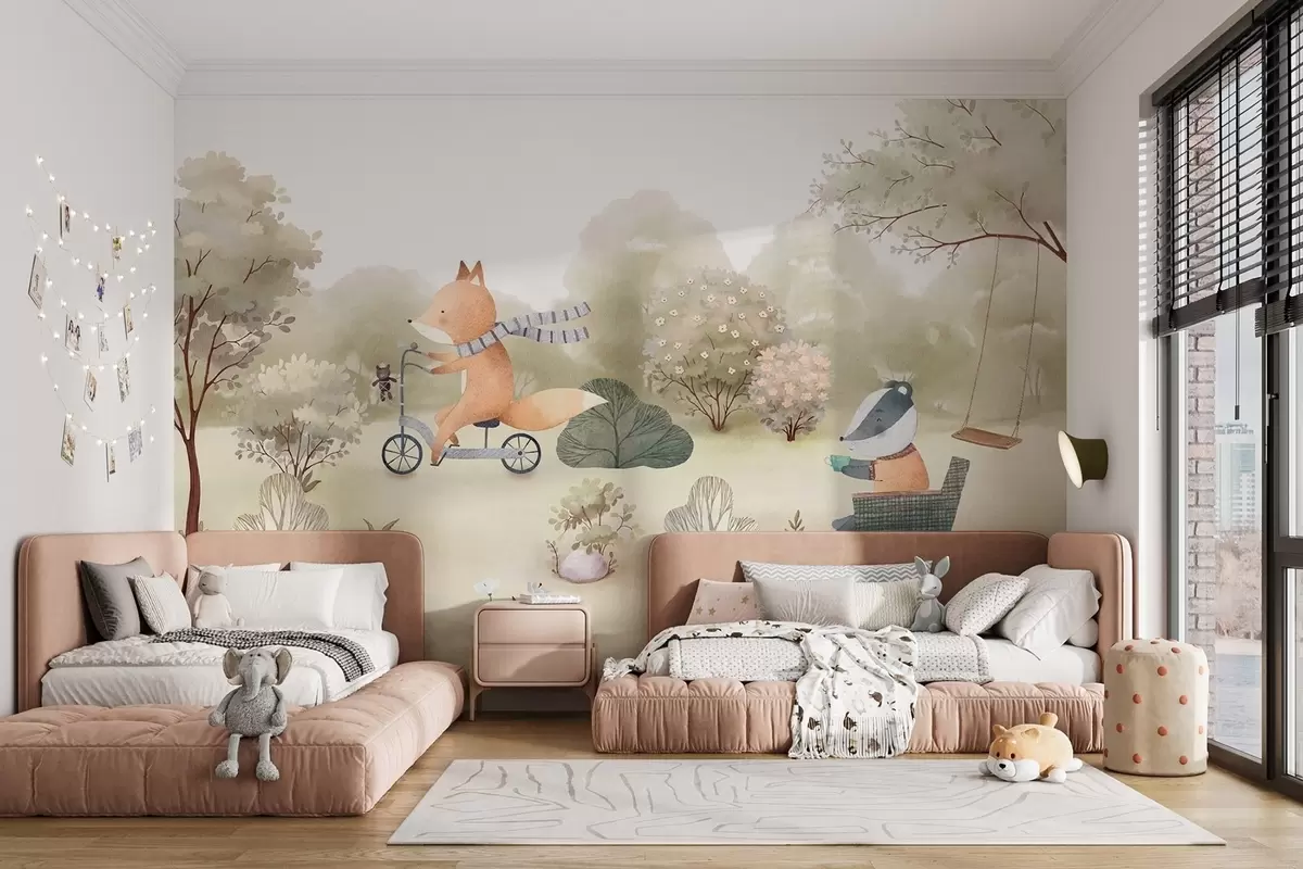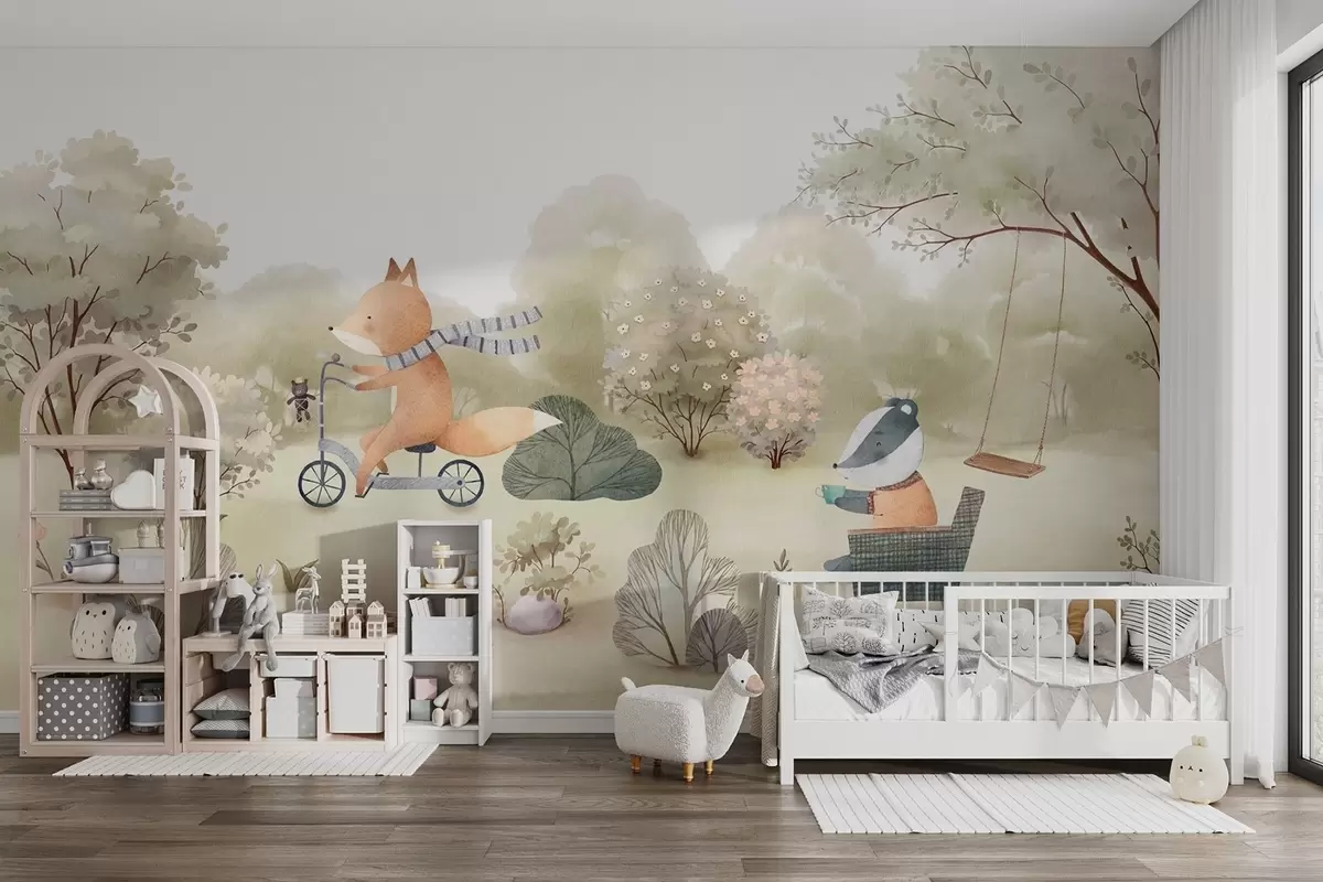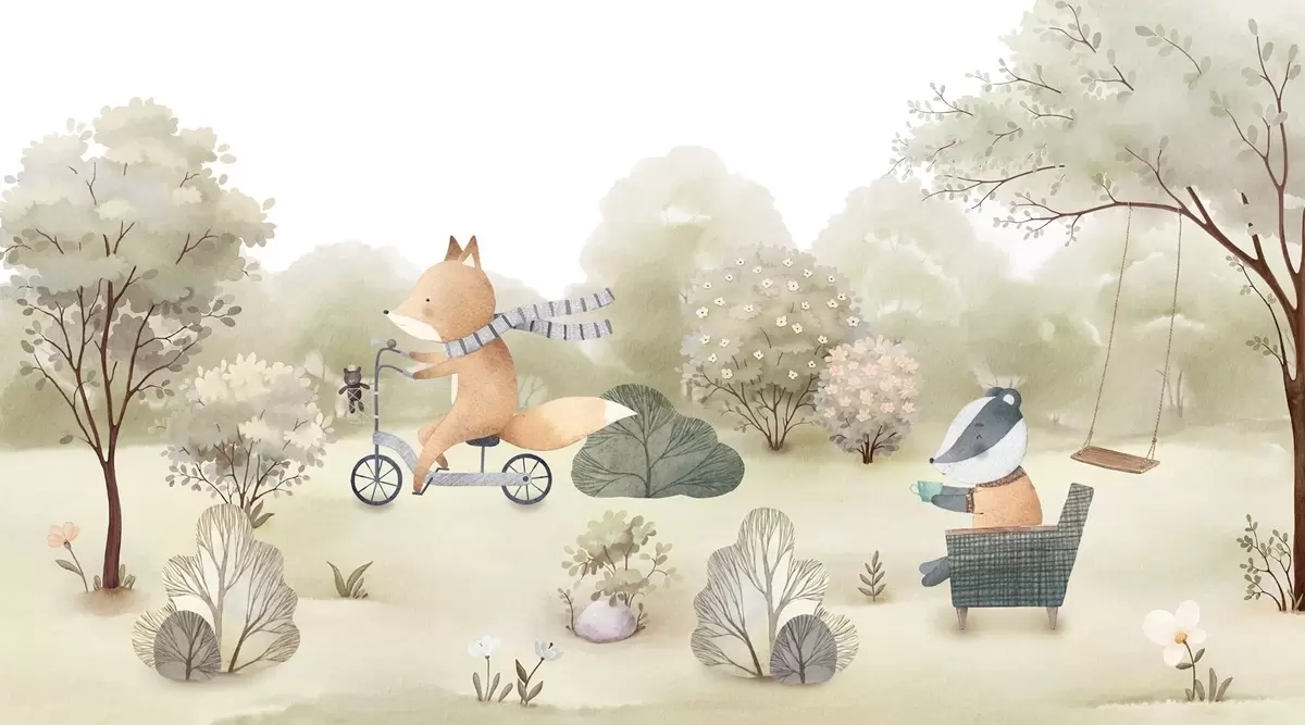 Fototapeedid Jänes jalgrattal ja mägiorav teega, metsa loomad akvarellistiilis Nr w09439