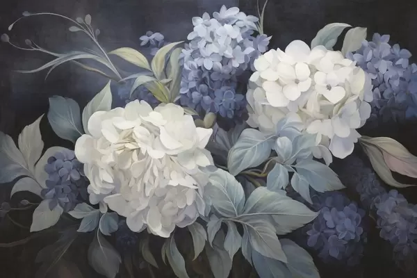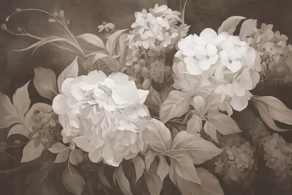 Fototapeedid Tekstuuriga seepia maal, mis imiteerib hortensiaõisi suurte lehtedega, abstraktne ja tume taust Nr w09465