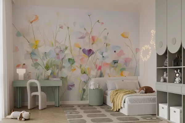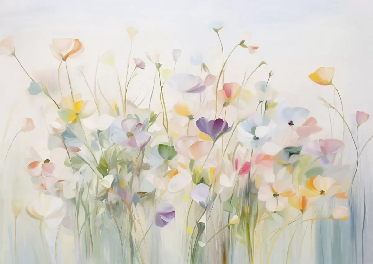Fototapeedid Abstraktne värvikate lillede väli pikkade varte ja roheliste lehtedega, tekstuuriga, pastelltoonides, heledates värvides Nr w09466