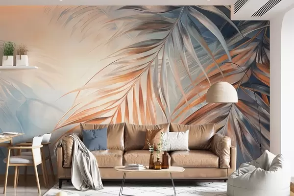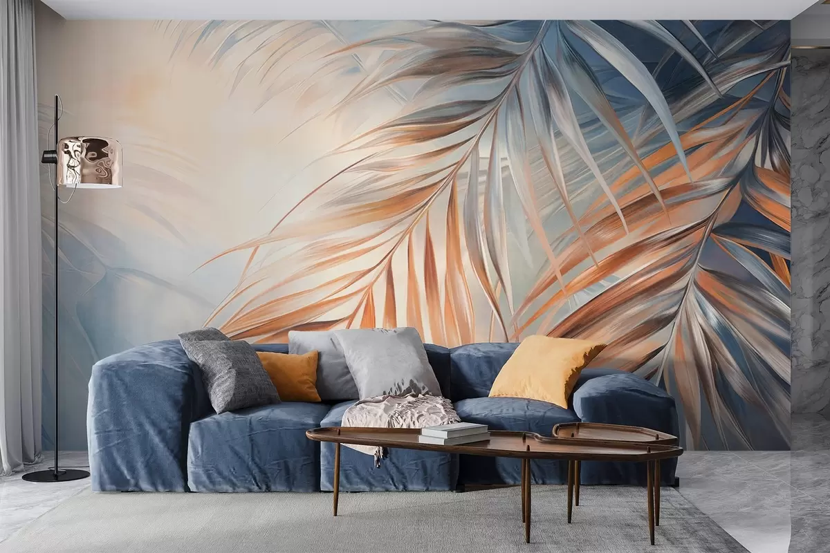 Fototapeedid Oranži ja sinise tooniga palmilehed, heleda tekstuuriga taust pehmetes värvides, elegantne troopiline stiil Nr w09475