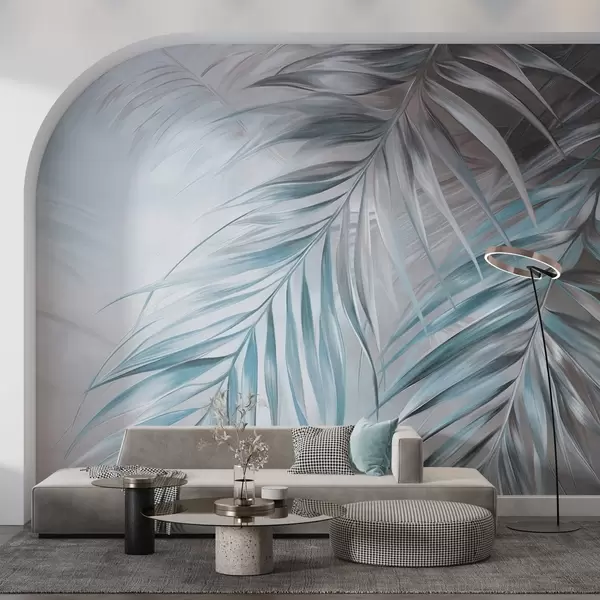 Fototapeedid Hallide ja siniste toonidega palmilehed, heleda tekstuuriga taust pehmetes värvides, elegantne troopiline stiil Nr w09475v1