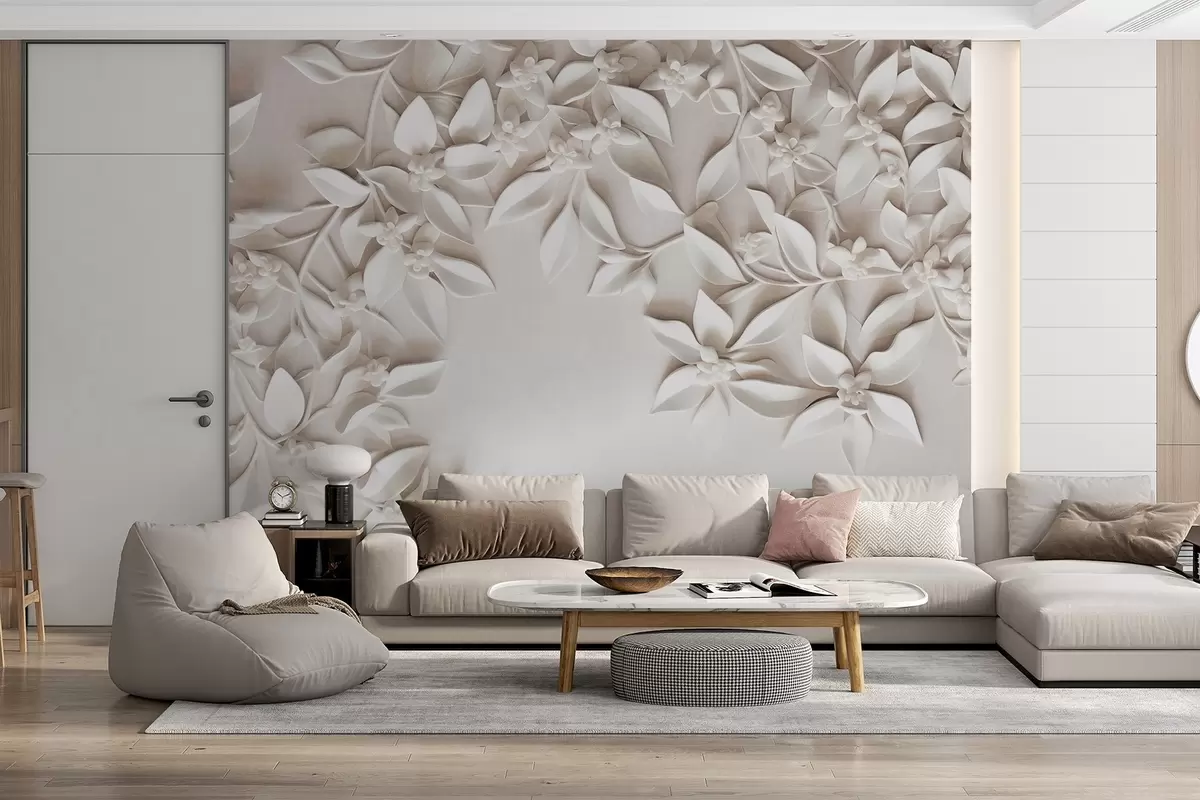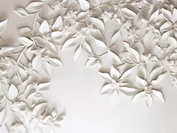 Fototapeedid Valged tekstuuriga lilled ja lehed, lillekompositsioon, elegantne disain, minimalistlik stiil, dekoratiivkunst Nr w09479