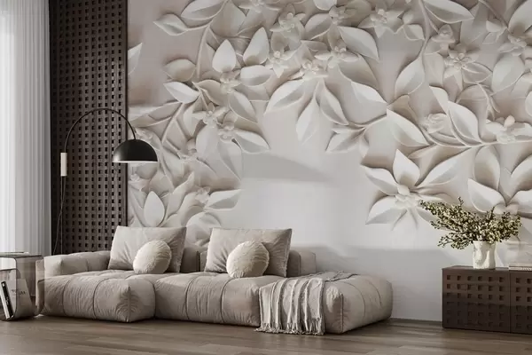 Fototapeedid Valged tekstuuriga lilled ja lehed, lillekompositsioon, elegantne disain, minimalistlik stiil, dekoratiivkunst Nr w09479
